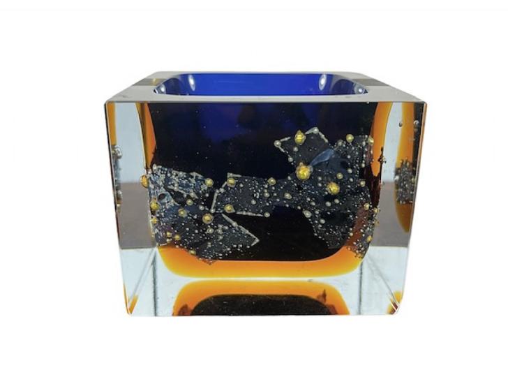 Popelník z broušeného skla z dílen Exbor Czechoslovakia, od autora Pavla Hlavy. Je vyroben z čirého skla a má indigově modré jádro zasazené do tmavě žlutého podkladu. Specifický dekorační prvek zde zatavená stříbrná folie, která se mění ve světlý povlak na tmavém pozadí a tvoří malé bublinky zlatavé barvy. Popelník měří na výšku 7 cm, rozměry na šířku jsou 9 x 9 cm, rozměry hrdla jsou 7 x 6,5 cm. V perfektním stavu bez poškození, pouze lehké škrábance na podstavě. Značeno gravírováním ExBor Czechoslovakia.