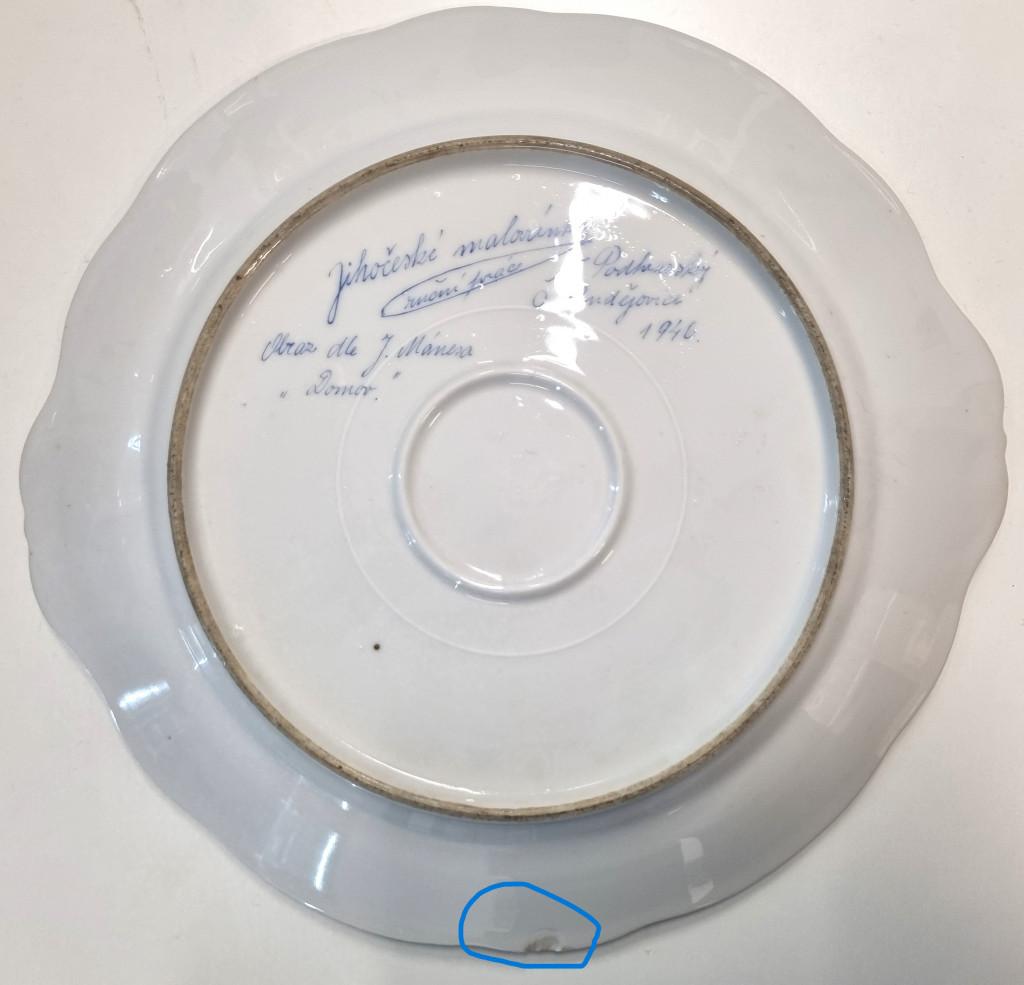 Dekorativní závěsný talíř s ručně malovaným motivem je dílem výtvarníka Václava Podhrázského. Výjev ve středu talíře je variací díla Josefa Mánesa "Domov". Průměr talíře je 28 cm. Drobný oťuk na spodní straně talíře je jedinou vadou na kráse.