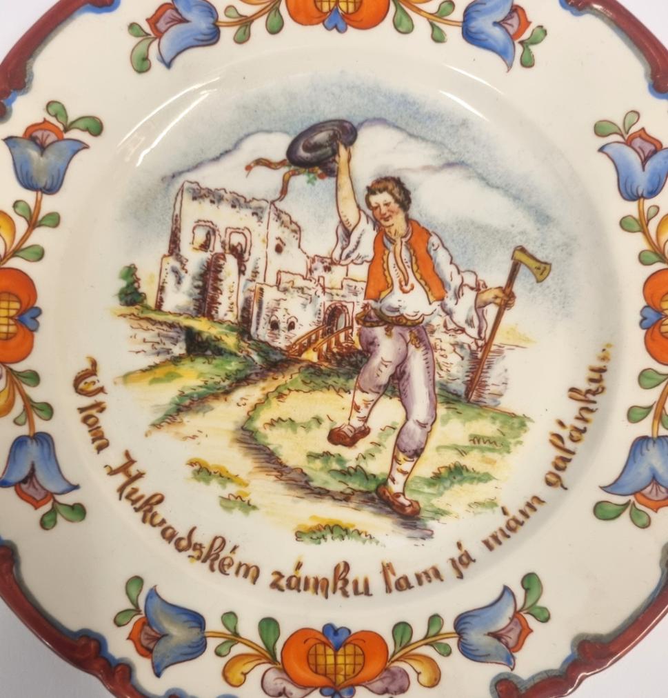 Dekorační talíř s valašským ručně malovaným motivem k zavěšení na stěnu, zdobený motivem mladého šohaje a nápisem: "V tom Hukvaldském zámku tam já mám galánku."