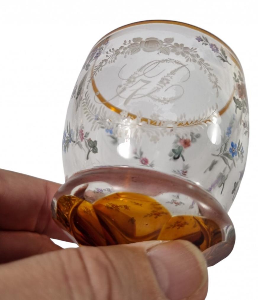 Krásný, ručně zdobený pohár na broušené nožce s růžovou a jantarovou lazurou. Pohár je zdobený květinami a florálním gravírovaným medailonem s monogramem. Na výšku měří 13 cm. Průměr hrdla je 7,5 cm, průměr podstavy je 7 cm. V perfektním stavu bez poškození. Neznačeno.