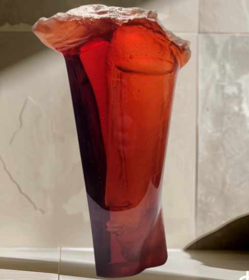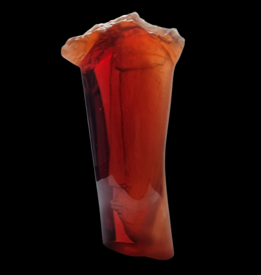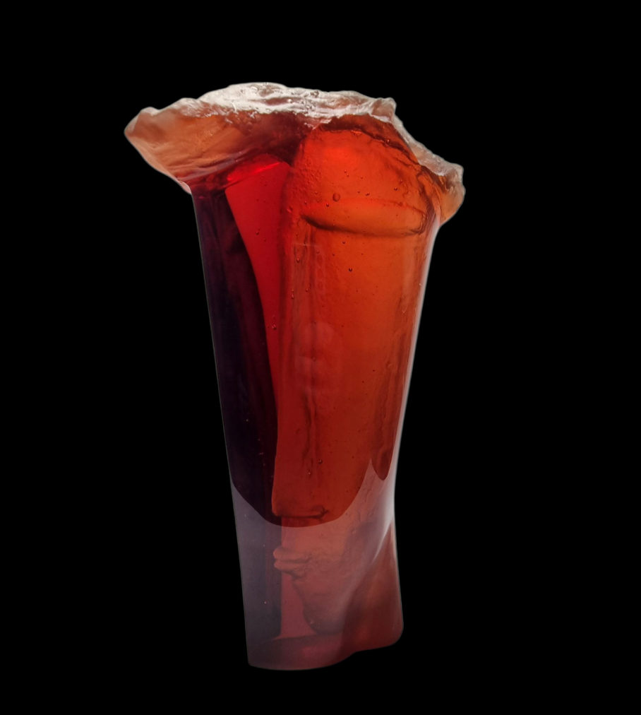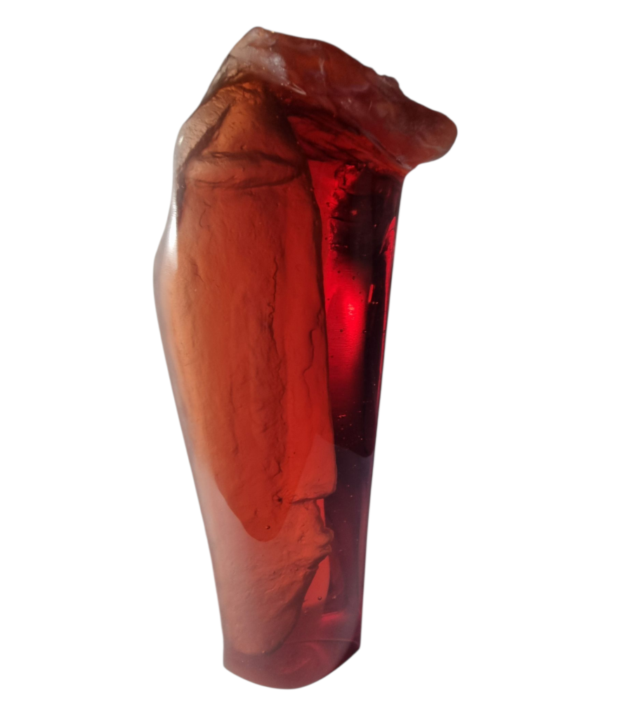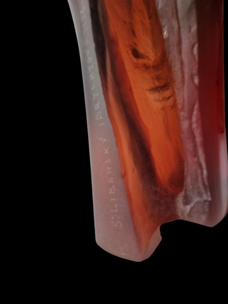 Skleněná plastika od ikonického dua Brychtové a Libenského. V plastice kombinují surovost a uhlazenými konturami tváře a střídáním lesklých a matných ploch. Bublinky, které přirozeně v procesu tvorby skla vznikají, dodávají plastice na snové atmosféře. Skleněná plastika, rozměry 34,5 x 16 x 11 cm, rozměr podstavy 12 x 6 cm. Pravděpodobně se jedná o pozdější odlitek v perfektní kvalitě, od originálu se liší pouze signnaturou na zadné straně ,,S Libenský J. Brychtová 1958-87,,