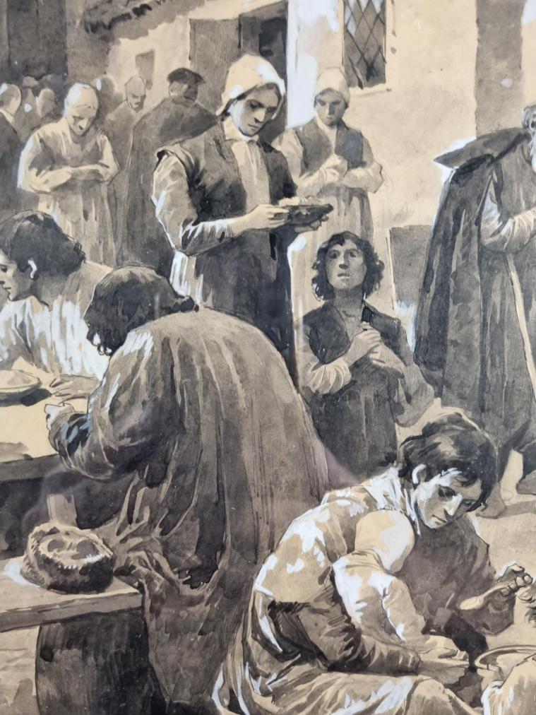 Krásné dílo s námětem pohledu do uličky města, kde se shlukují davy chudých i urozených. V pozadí se rozléhá architektura, autor pracuje s akvarelem, který umožňuje velmi jemné přechody a odchylky v odstínu. Autor detailně vystihuje tváře osob, motiv chudých žebrajících lidí či matky, která se snaží nakrmit několik dětí je v kontrastu s bohatými občany, kteří tudy prochází. Kombinovaná technika na papíře, neodborně rámováno pod sklem, rozměry s rámem 53,5 x 43,5 cm, rozměr díla 39 x 27 cm. Nesignováno, připsáno Viktoru Olivovi.