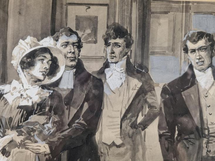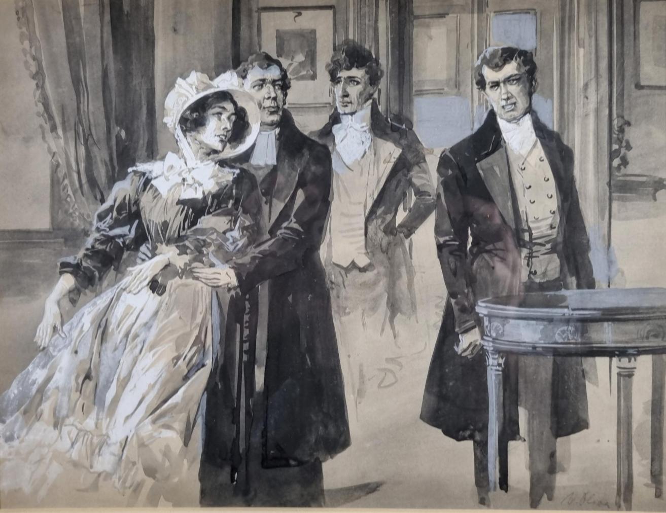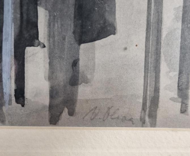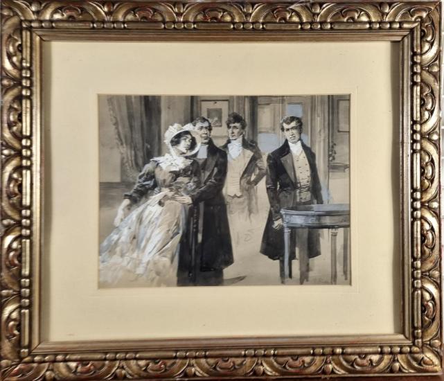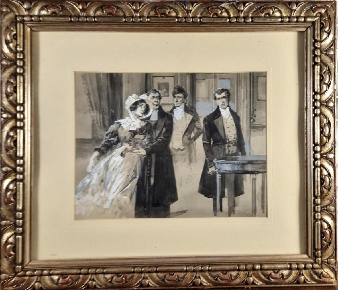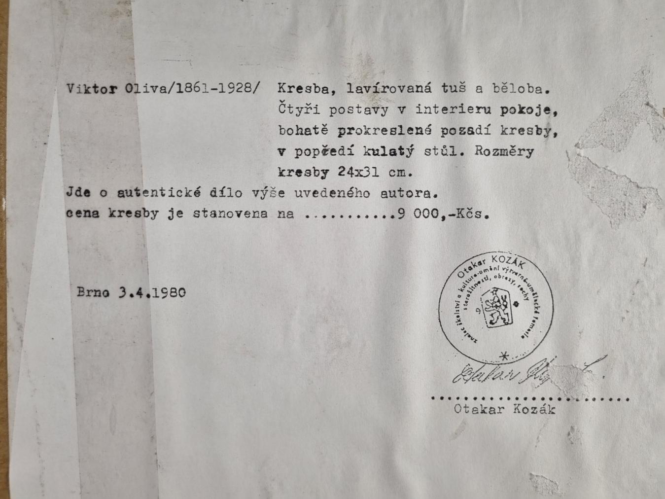 Krásné dílo od autora Viktora Olivy s námětem lehce napjaté situace mezi čtyřmi figurami v interiéru bytu. Umělec v díle kombinuje několik technik, vytváří tak zajímavou formální stránku, velkou pozornost věnuje práci se světlem a stínem. Motivy nechává vyznít do ztracena. Kresba, lavírovaná tuš a běloba na papíře, rámováno pod sklem, rozměry s rámem 53 x 46 cm, rozměry díla 31 x 23 cm. Vzadu je štítek s autorem. Signováno vpravo dole.