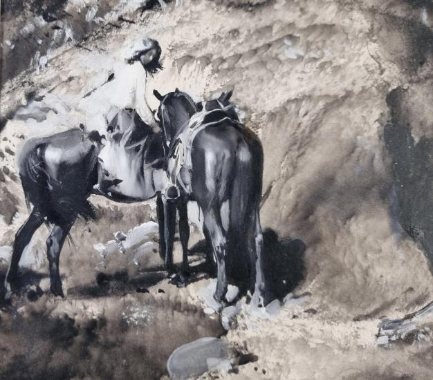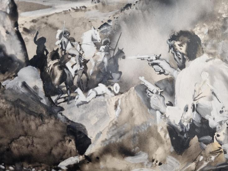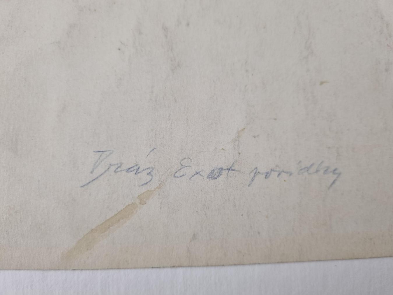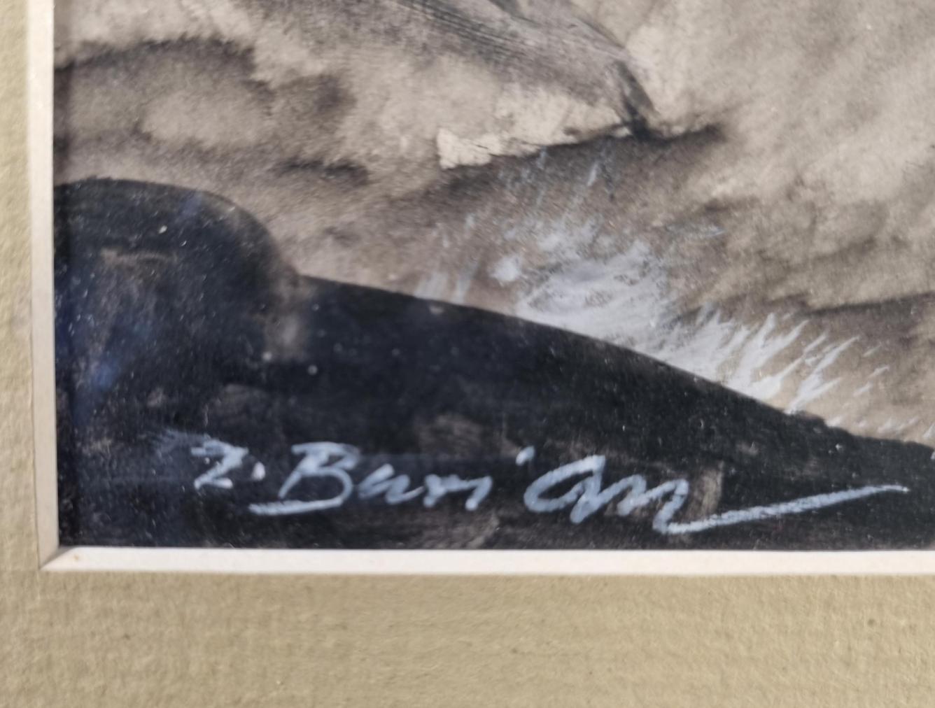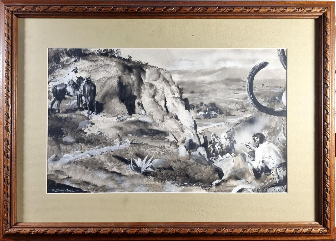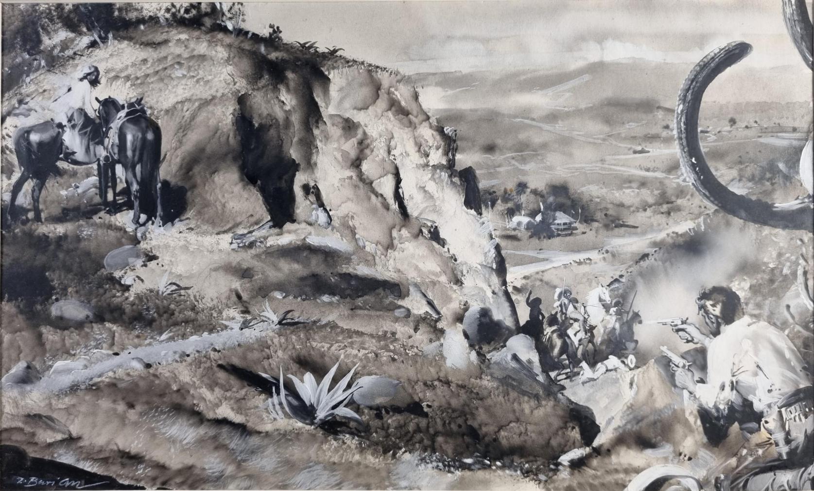Dílo od Zdeňka Buriana, velmi významného českého výtvarníka, který se stal inspirací pro mnohé další umělce. Burian zachází v dílech s neuvěřitelnou mírou realističnosti, motivy zasazuje do pravěkých krajin. Ty tvoří za pomoci rozpitých ploch, pracuje s barvou různými způsoby a technikami a dosahuje velmi originálních struktur a efektů. Kombinovaná technika na papíře, rámováno pod sklem, rozměry s rámem 59 x 42 cm, rozměry díla 42 x 25 cm. Signováno vlevo dole "Z. Burian". Na zadní straně razítko a pracovní název.