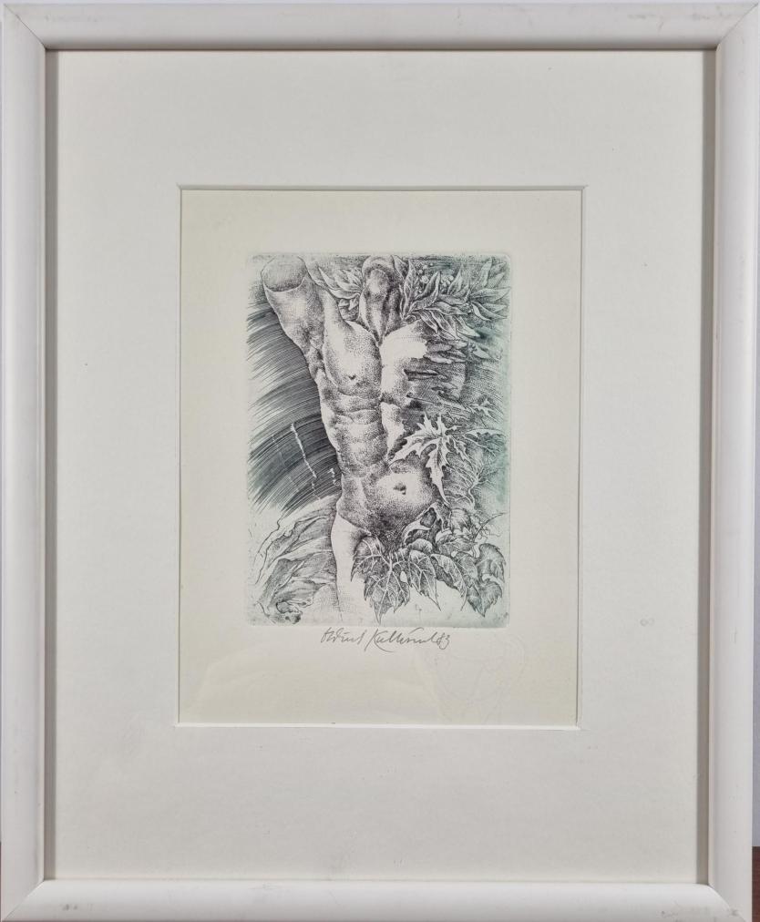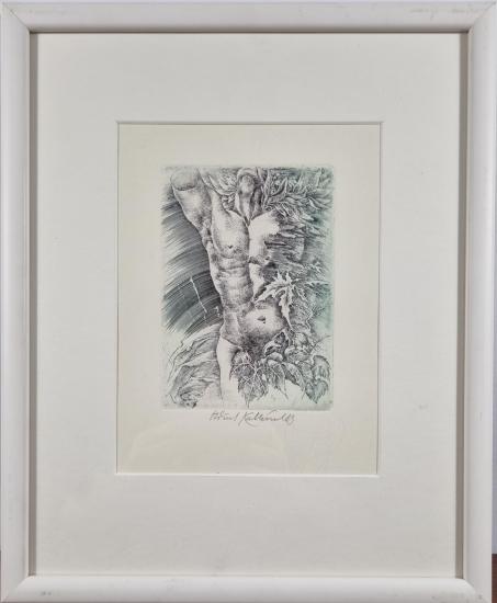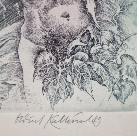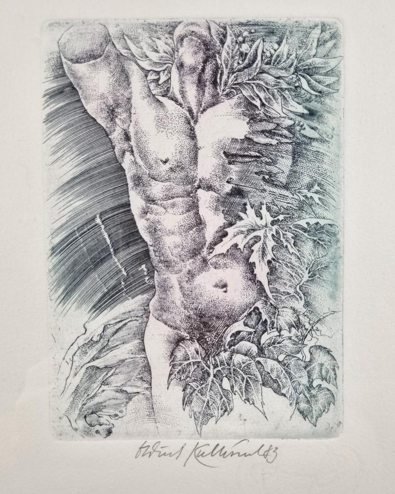 Prohlednout celou aukciGrafika od našeho významného výtvarníka Oldřicha Kulhánka. V centru se rýsuje torzo mužské postavy, do které se vpíjí listy a větve stromů. Šrafura nalevo působí dynamicky, jako by znázorňovala kruhový pohyb a procházela celým námětem skrz. Kulhánek je výjimečný perfektním ovládnutím grafických technik a realistického zobrazení. Grafika na papíře, rámováno pod sklem, rozměry s rámem 36 x 29,5 cm, rozměry díla 14,5 x 10 cm. Signováno dole uprostřed "Oldřich Kulhánek 83".