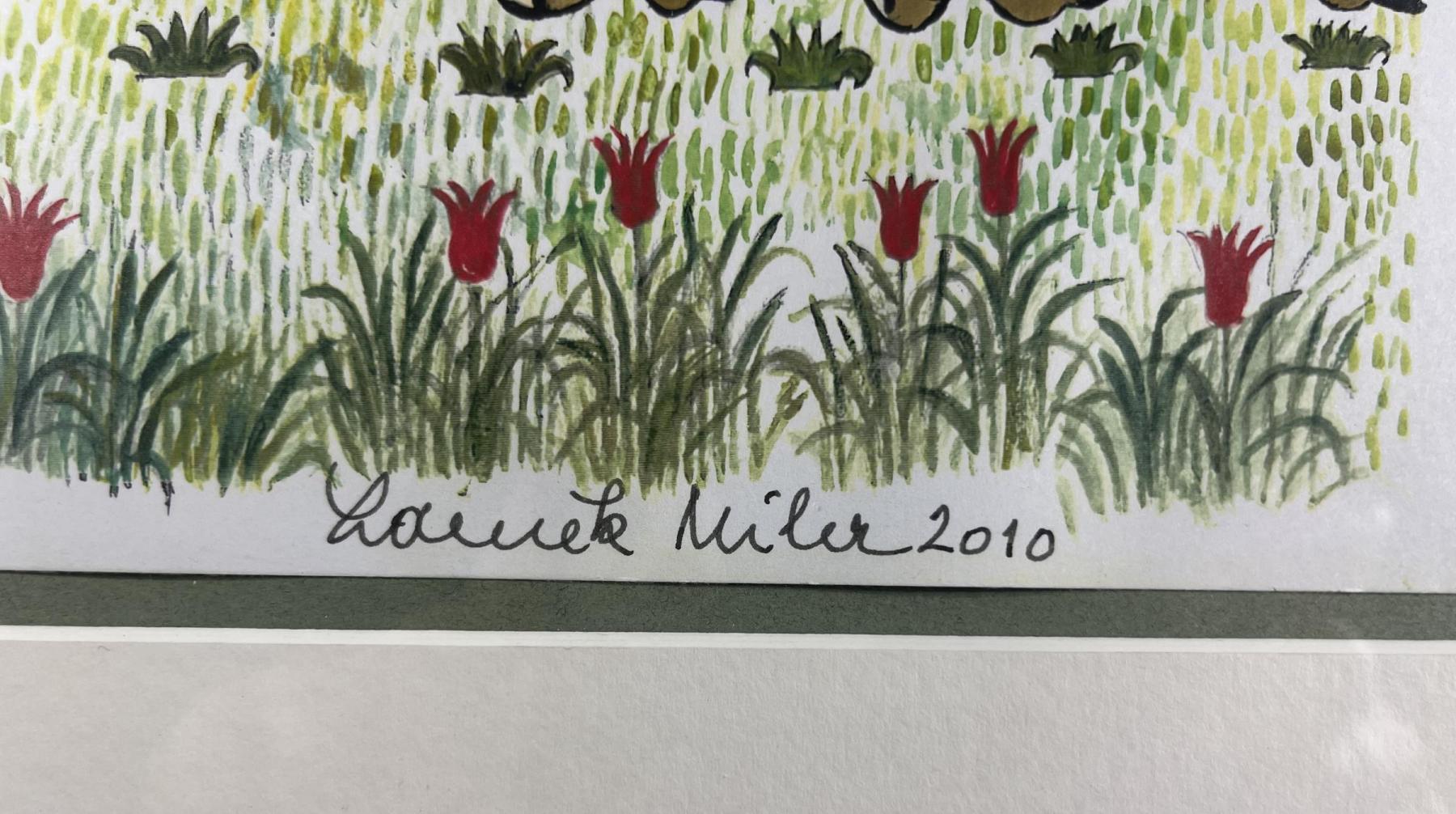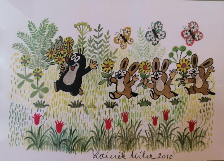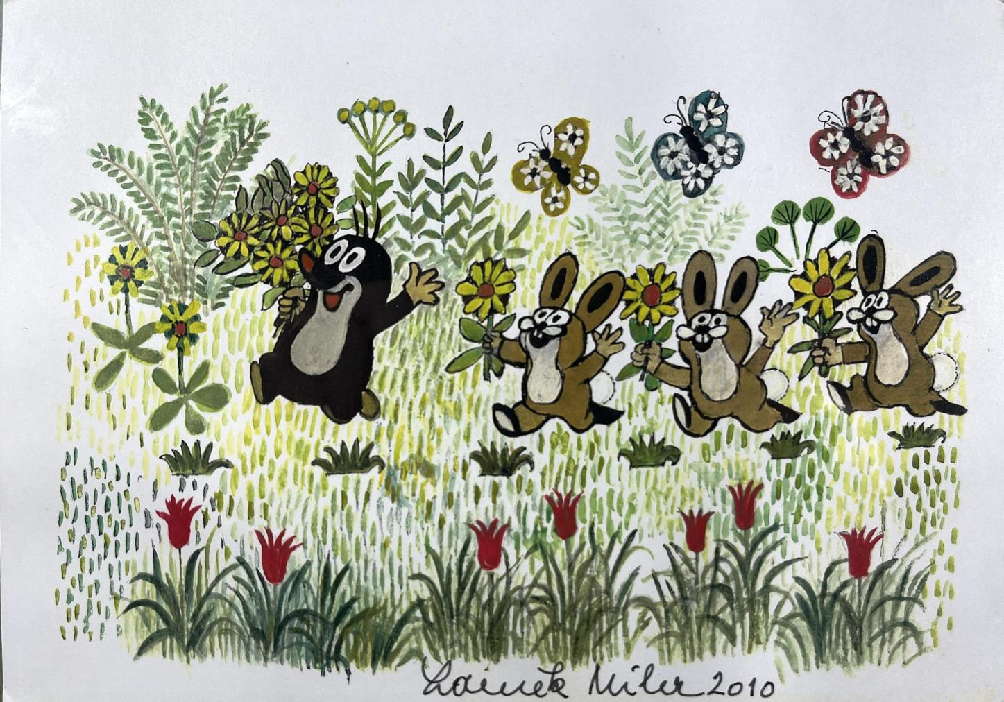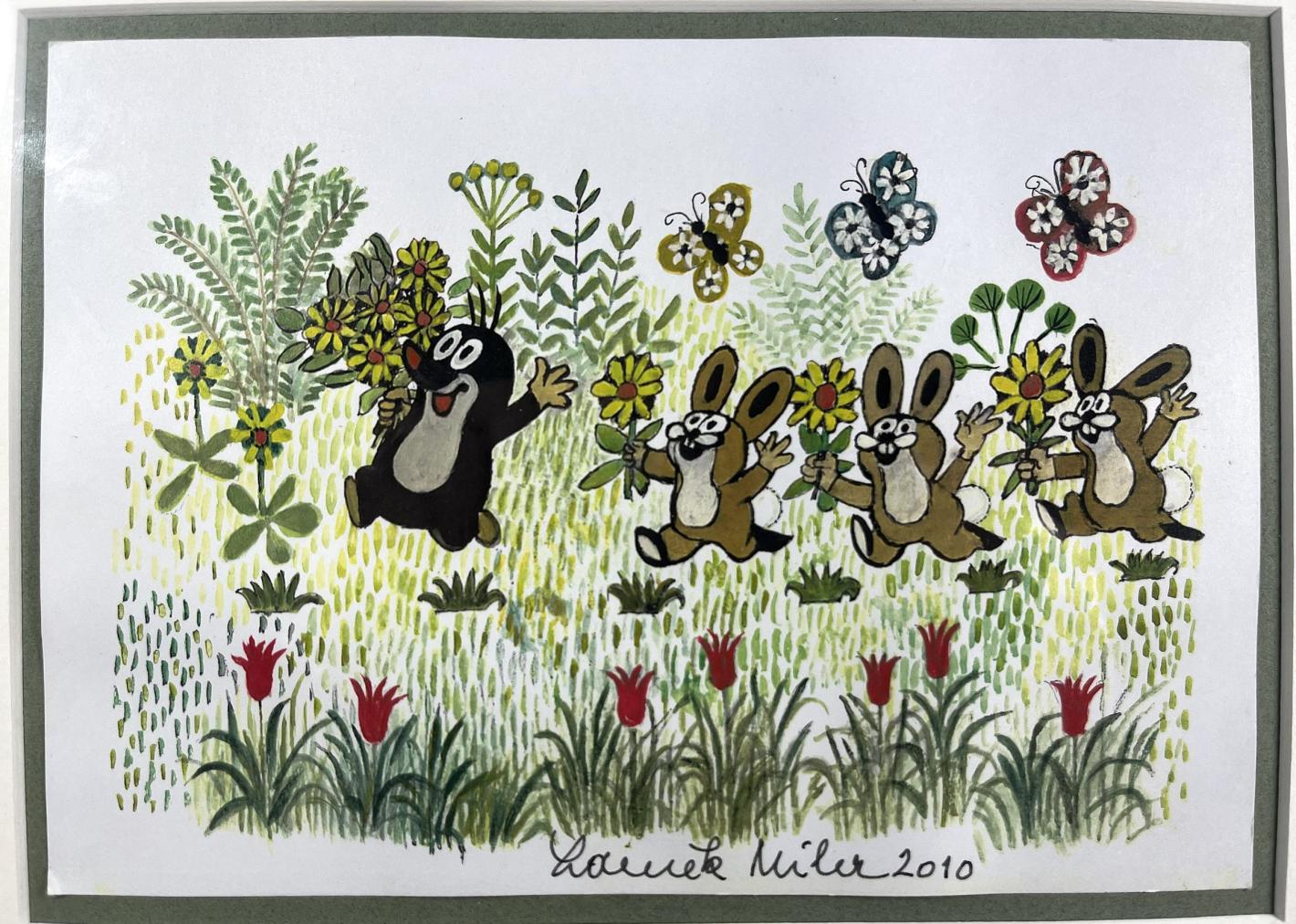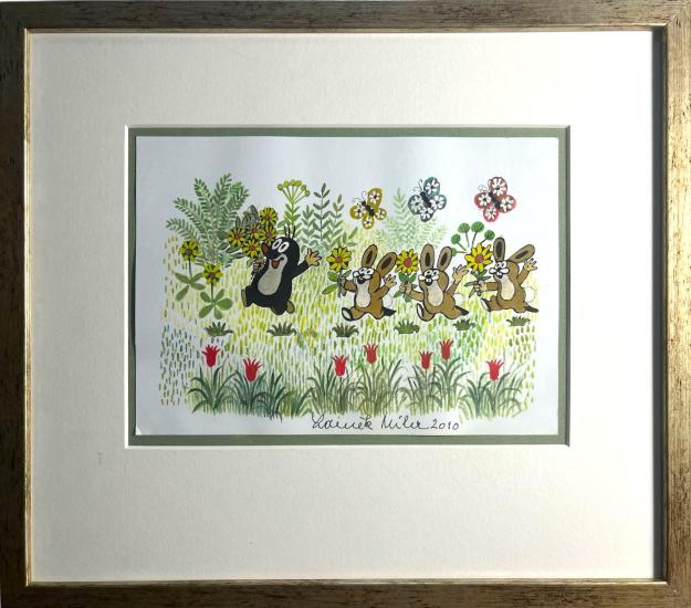 Prohlednout celou aukciDílo od Zdeňka Milera s jeho nejznámější postavou Krtečka. V díle se rozléhá louka plná života, vespod se tyčí nádherné tulipány a krteček se svými kamarády nese plnou náruč květin. Nad nimi poletují motýli. Miler opakovaním stejných motivů vytváří roztomilý svět plný radosti. Tisk/ofset na papíře, rámováno pod sklem, rozměry s rámem 34 x 30 cm, rozměry díla 20,5 x 14,5 cm. Signováno dole - originál "Zdeněk Miler 2010".
