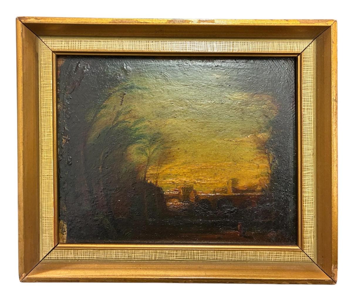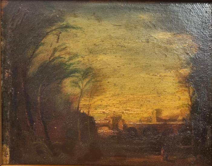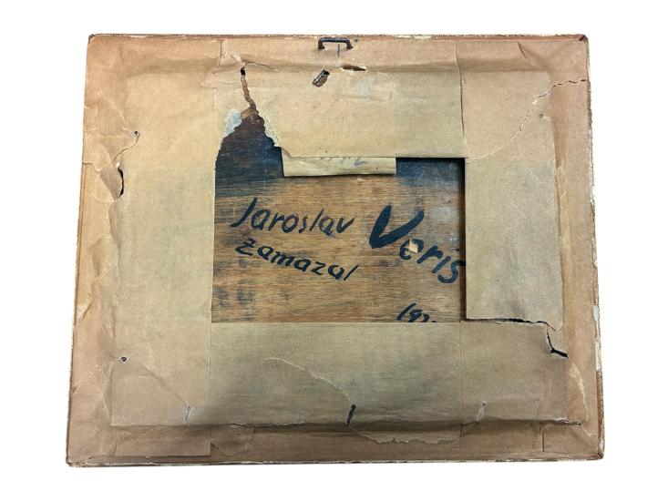 Prohlednout celou aukciStarožitná olejomalba na dřevěné desce náladově zachycující krajinu se stromy a mostem přes řeku. Nad městem jsou ještě vidět zbytky zapadajícího slunce a dodávají obrazu náladu teplého, tichého a romantického večera. Na zadní straně malby : Jaroslav Veris Zamazal a letopočet 1922 nebo 1923. Rozměry s rámem jsou 19 x 16 cm a bez rámu 15 x 12 cm.