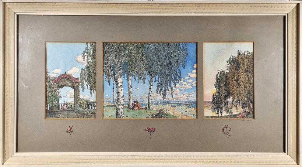Prohlednout celou aukciNádherné detailní dílo o 3 obrazech, které vypráví jeden příběh, od Otakara Štáfla. V každém obraze je neskutečné množství detailů, umělec v díle kombinoval akvarel s perokresbou, obojí s obrovskou dávkou citu a smyslem pro detail. Pod každým z obrazů vytváří symbol, detail, který vystihuje dění v obraze. Akvarel a perokresba na papíře pod sklem, rámováno pod sklem, rozměry s rámem 65 x 36 cm, rozměry jednotlivých děl na kartonu : 17 x 11 cm, 21 x 17 cm. Signováno Otakar Štáfl.