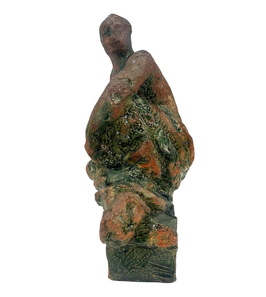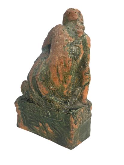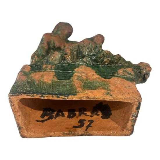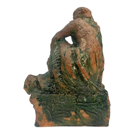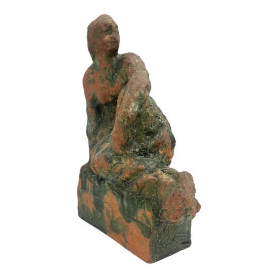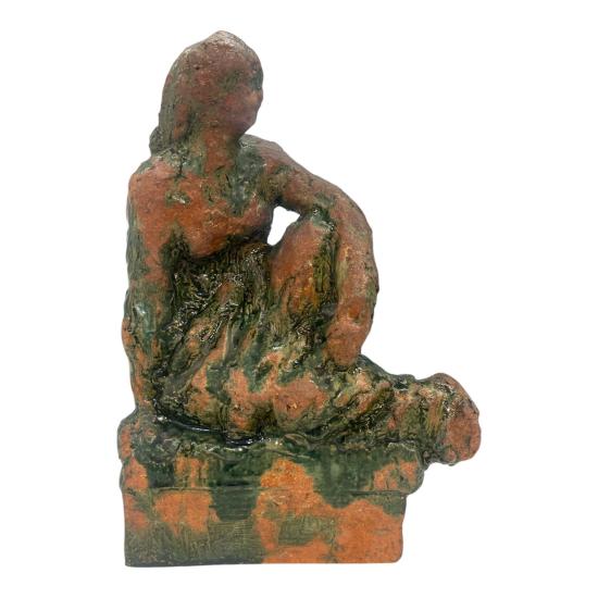 Plastika z pálené hlíny se zelenou polevou od významného českého sochaře Konráda Babraje. Autor zachycuje dívku v šatech sedící na vyvýšeném podstavci. Na výšku měří socha 27,5 cm. Na šířku měří 20 cm. Hloubka je 14 cm. Menší poškození v podobě oťuku v oblasti hlavy. Rozměry podstavce jsou 15,5 x 7 cm, na výšku má 7 cm. Signováno z vnitřní strany viz foto: Babraj 57.