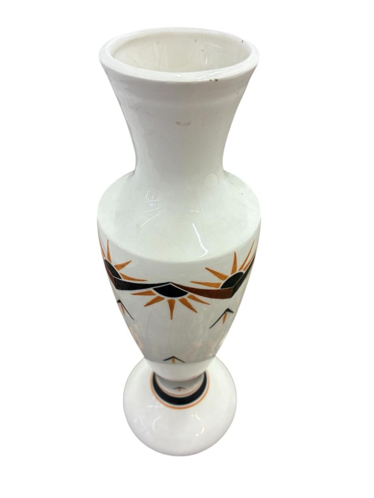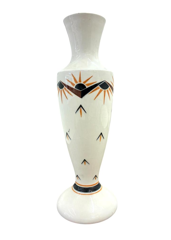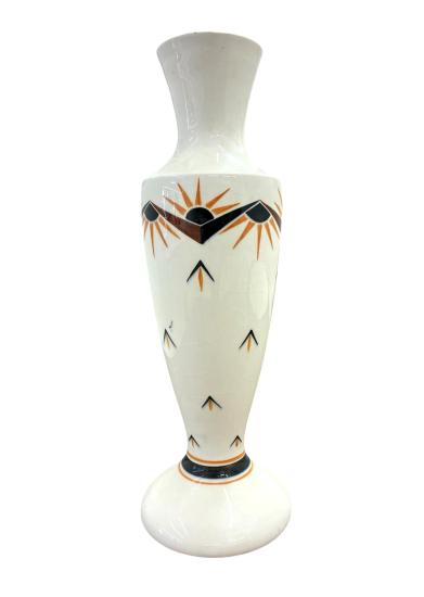 Starožitná porcelánová váza s výrazným Art Deco vzorem, z keramičky Bechyně. Na výšku měří 36 cm. Průměr hrdla je 8 cm, průměr podstavy je 13 cm. Místy krakelace v glazuře, jinak bez poškození. Značeno ze spodní strany podstavy- KS Bechyně, viz foto.