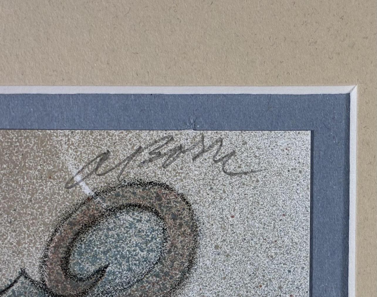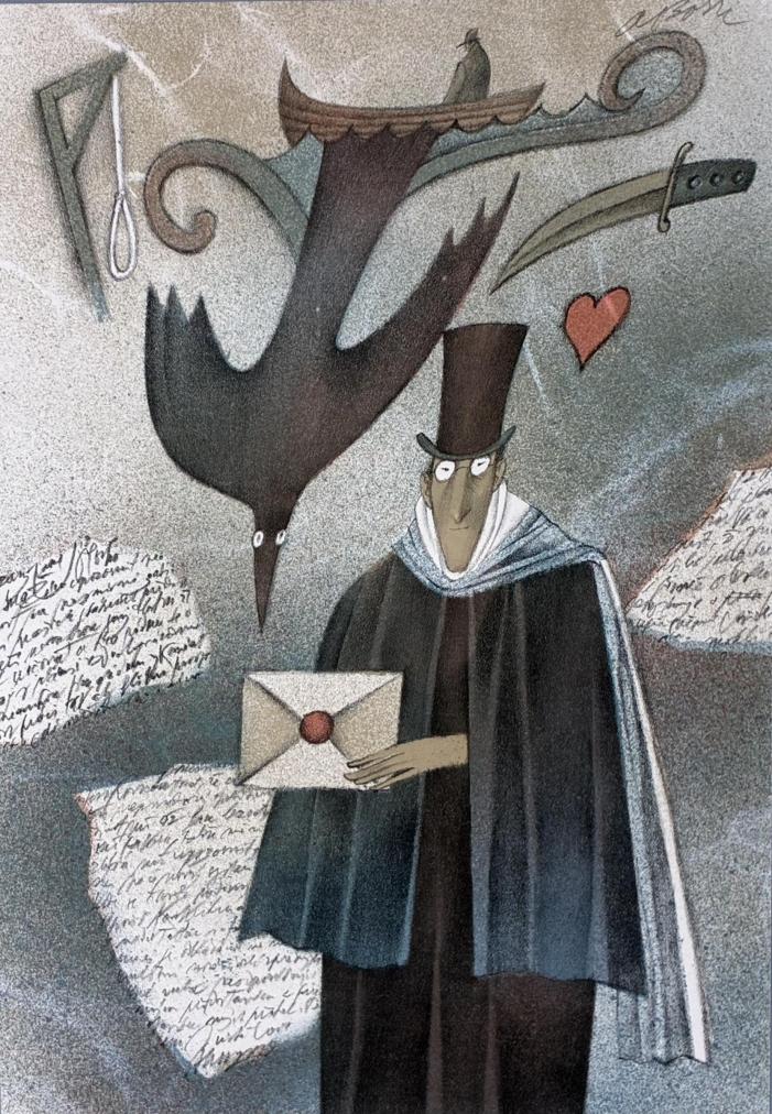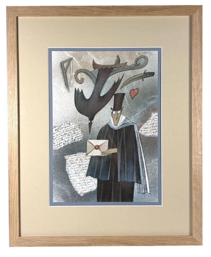 Grafika od našeho významného výtvarníka Adolfa Borna. V díle s námětem postavy muže, který v ruce drží dopis, najdeme koláživitě pojaté fragmenty dopisů, či různé symboly, jako je dýka, či srdce. Umělec často sahá po metafoře, nechává motivy přecházet v jiné a tak v díle otevírá novou, hravou rovinu významů. Litografie na papíře, rámováno pod sklem, rozměry s rámem 47 x 38,5 cm, rozměry díla 30 x 20,5 cm. Signováno nahoře A. Born.