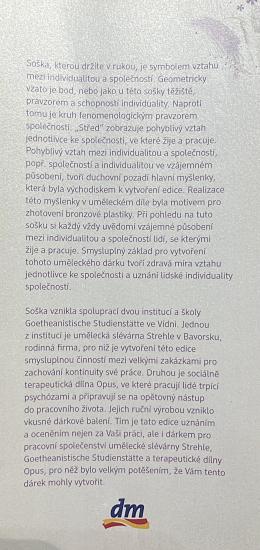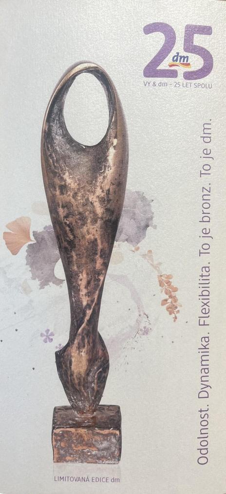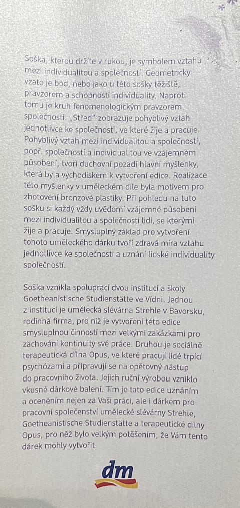 Bronzová plastika ve tvaru kapky, odlitá a darovaná k příležitosti výročí 25 let ve firmě dm drogerie markt. Výška je 27 cm, v nejširším bodě 7 cm. Hloubka dle podstavce 5,5 cm. Podstavec má rozměry 2,5 x 5,5 x 5 cm a je dutý. V perfektním stavu bez poškození. Vyrobeno ve spolupráci dvou institucí a školy Goetheanistische Studienstatte ve Vídni. Jednou z institucí je umělecká slévárna Strehle v Bavorsku a sociálně terapeutická dílna Opus, která vyrobila originální balení. Nesignováno, neznačeno, s původní kartou- poděkováním.