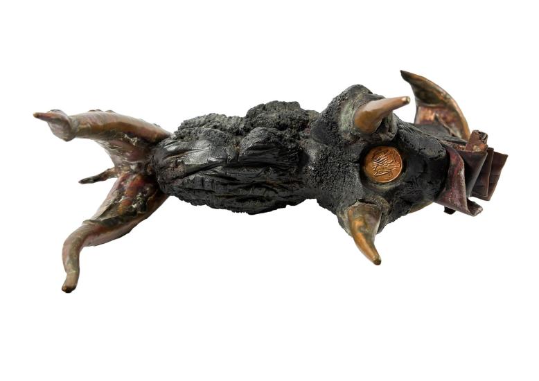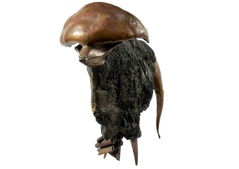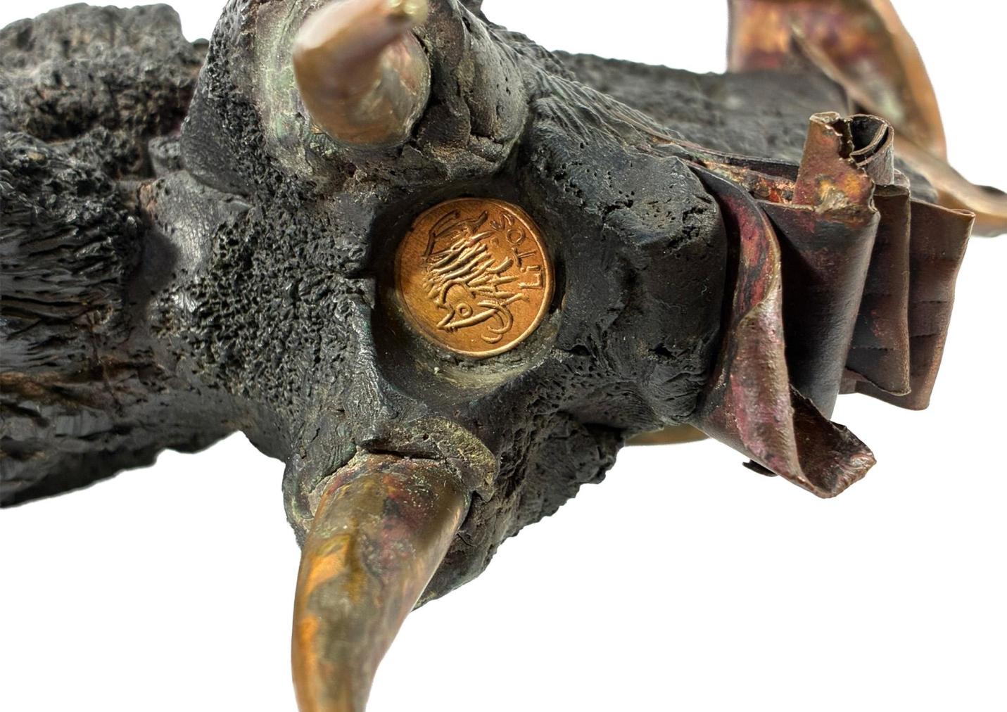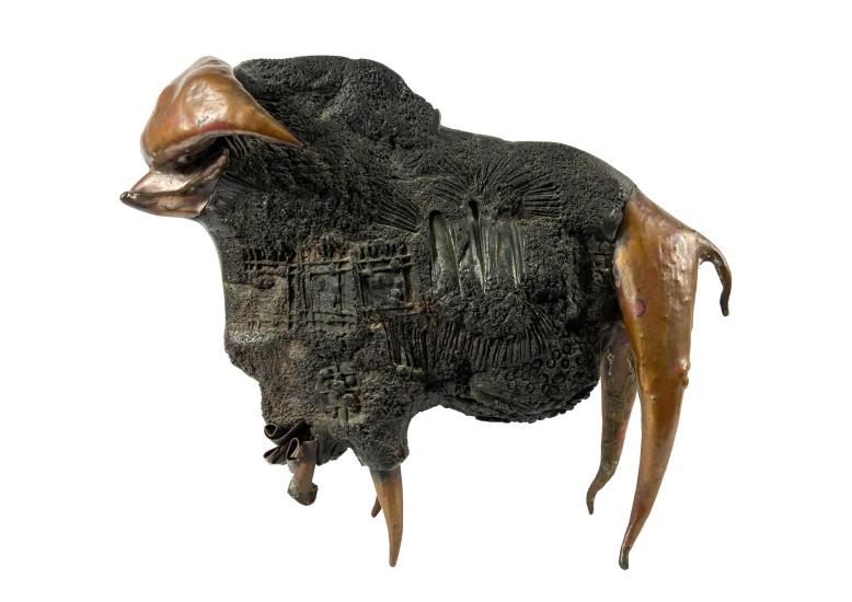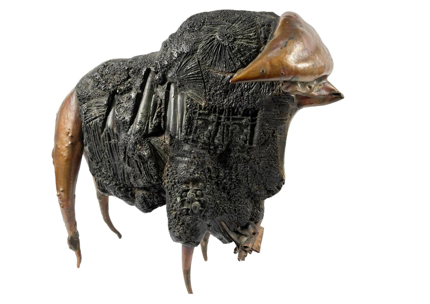 Zajimavá, originálně pojatá socha buvola od Litoše Emanuela je kombinací kovu a dřeva, do kterého jsou vyryté různé struktury. Zespod sochy je vložena mince s podobiznou mamuta a nápisem "LITOS". Výška 23 cm, šířka 28 cm.