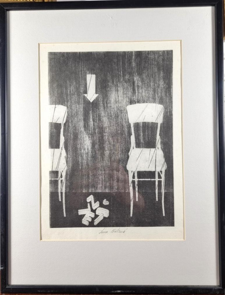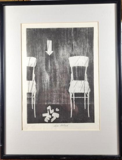 Grafické dílo od autorky Dany Chatrné, dcery významného českého umělce Dalibora Chatrného. Autorka v díle očividně odkazuje na přelomové dílo ,,Jedna a tři židle,, od Josepha Kosutha, silně konceptuální dílo, které změnilo tehdejší uvažování nad uměním a uměleckým jazykem. Vytváří dvě židle, mezi kterými je šipka odkazující k rozpadlému nápisu "židle". Suchá jehla na papíře, rámováno pod sklem, rozměry s rámem 50 x 38,5 cm, rozměry díla 30 x 21 cm. Signováno uprostřed "Dana Chatrná".