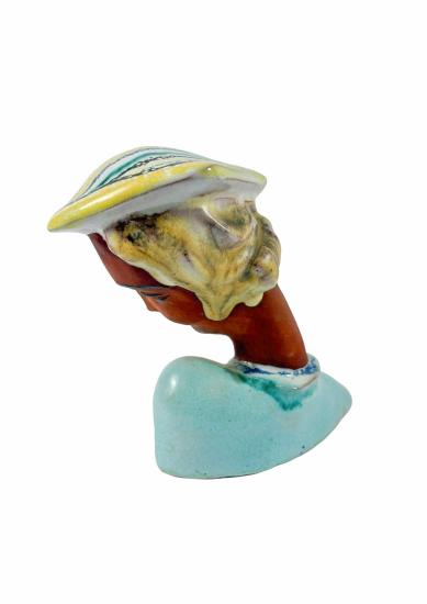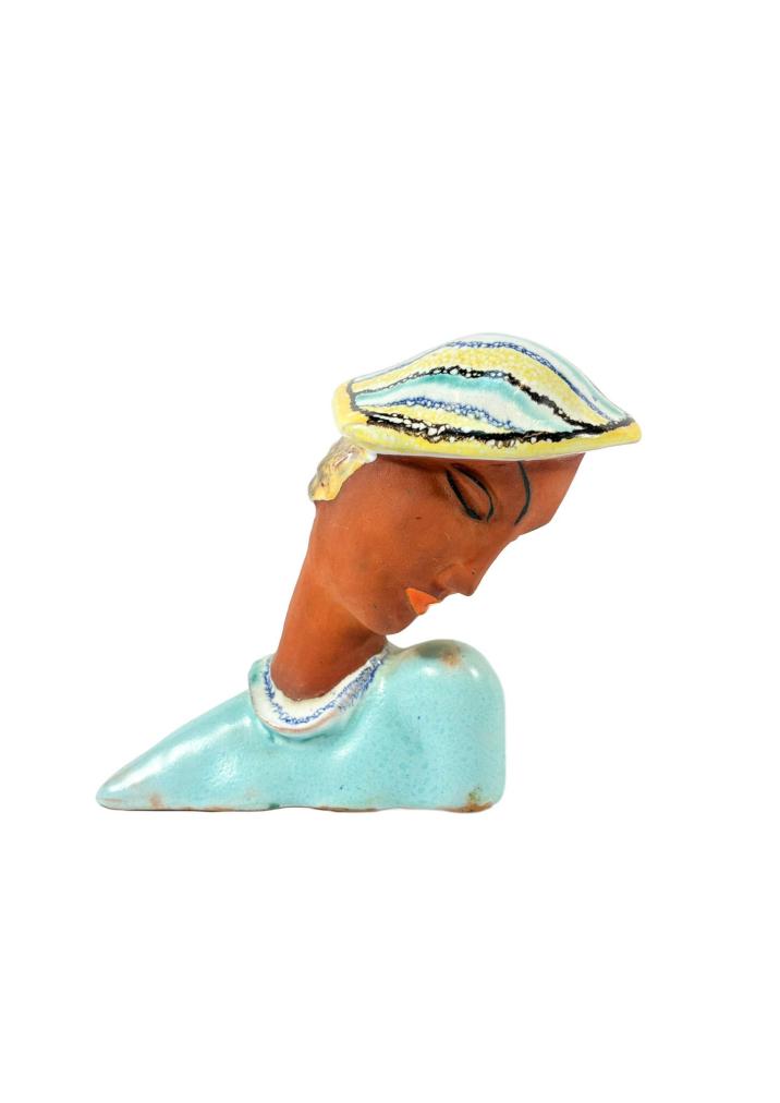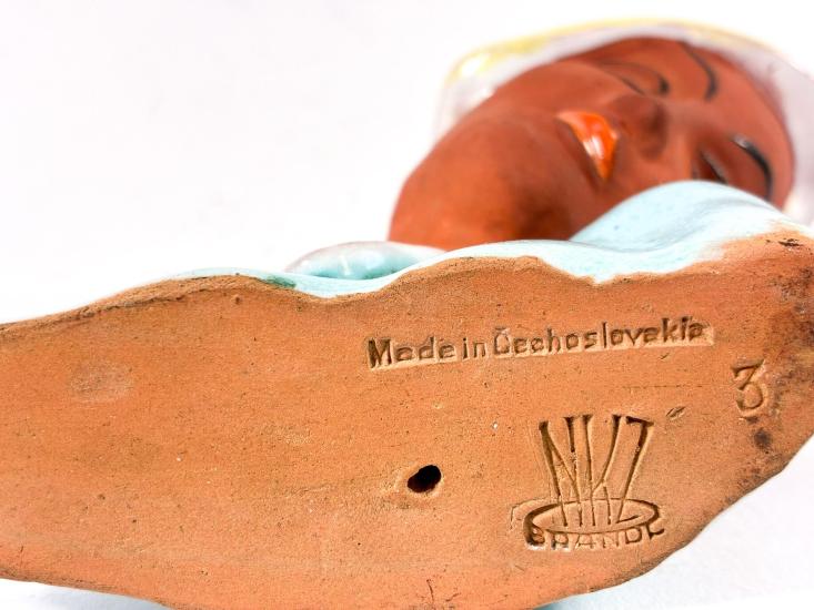 Drobná Art-Deco soška dámy, která má sklopený zrak. Hlavu jí zdobí klobouk s barevnou kresbou, detaily jsou tvořeny různými odstíny glazur, její tvář zdobí jemné linky, jinak zůstala v bez glazury. Výška 10,5 cm, v nejširším bodě 12 cm. Bez poškození. Značeno vespod "Made in Czechoslovakia, NKZ Brandl".