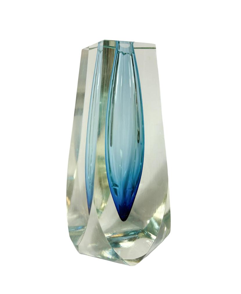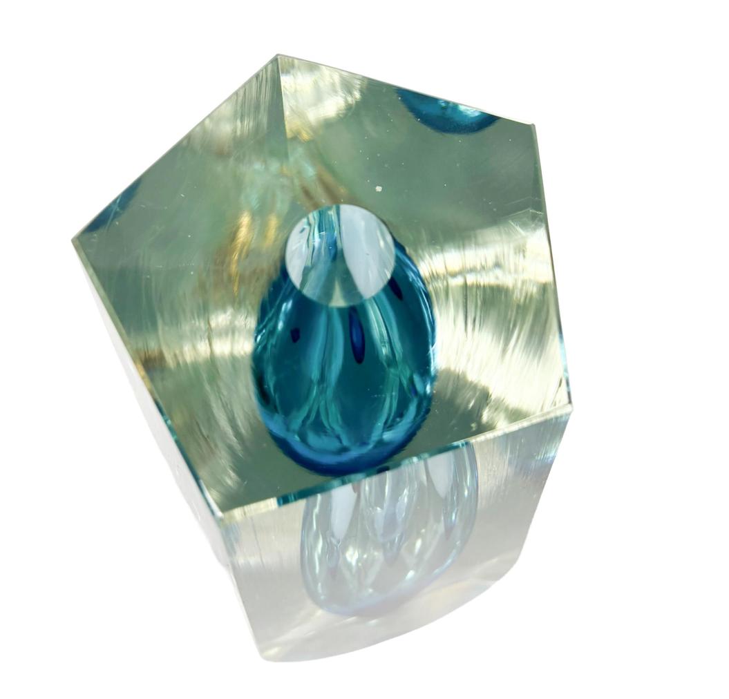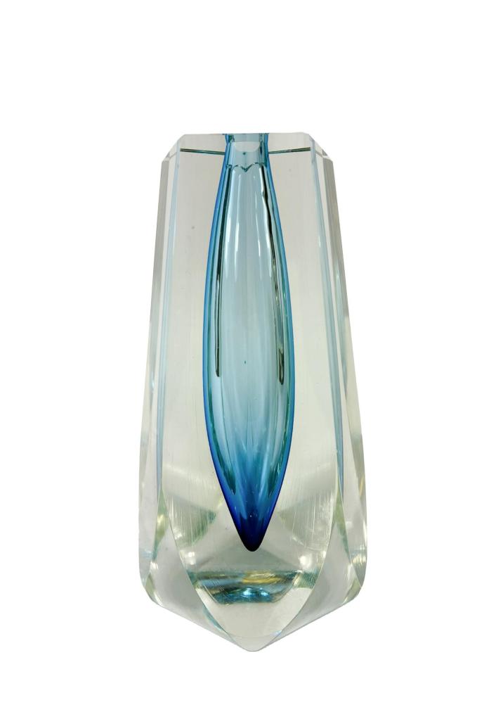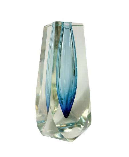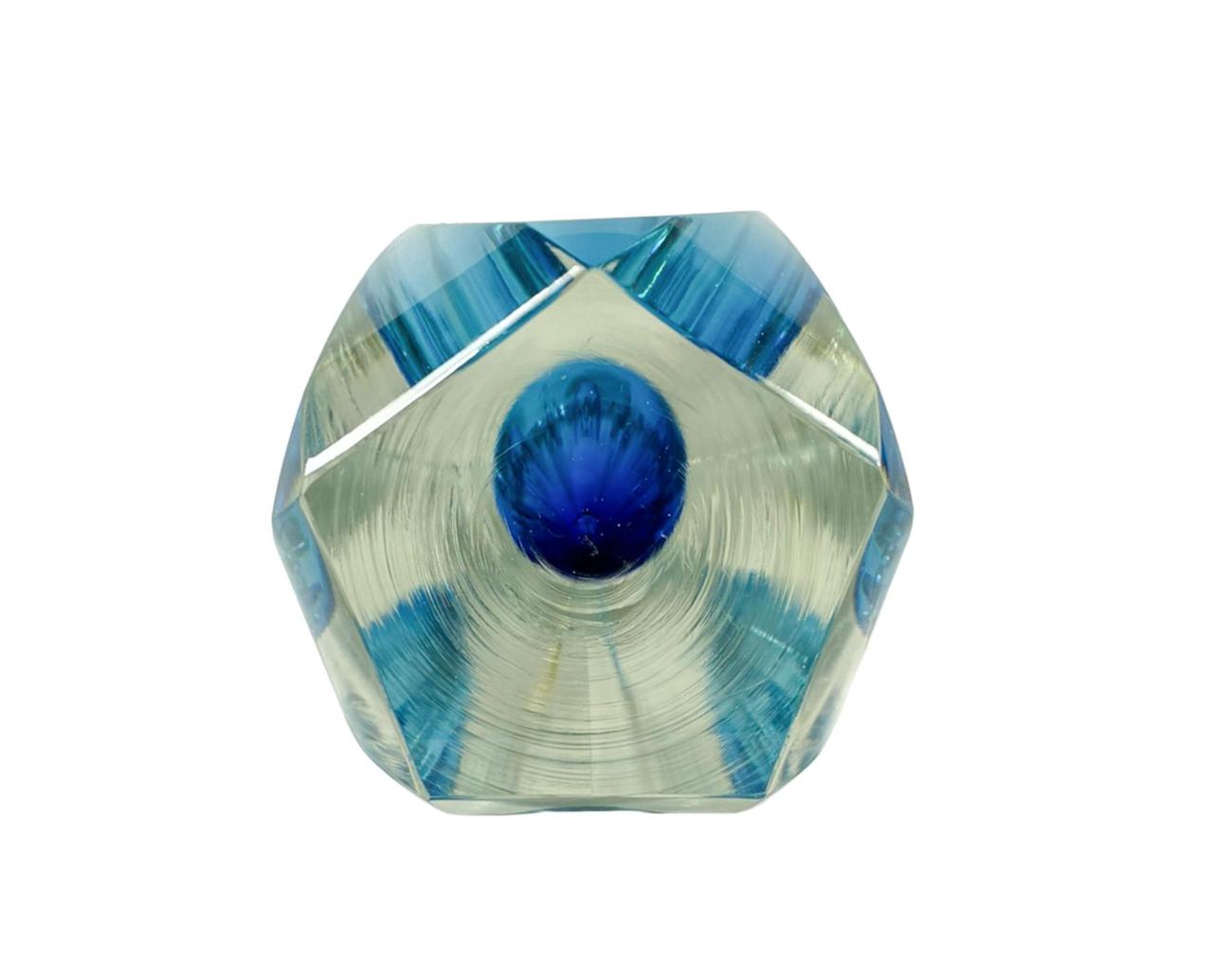 Nádherná váza od Pavla Hlavy s modrým jádrem, které přechází od sytého odstínu do jemného gradientu. Váza má 5 hran. Výška 18 cm, průměr 7 cm, průměr vnitřního otvoru 1,5 cm. Bez poškození.