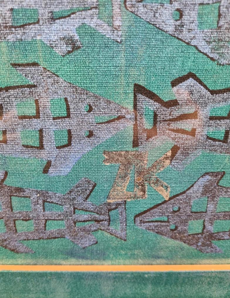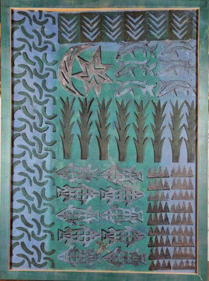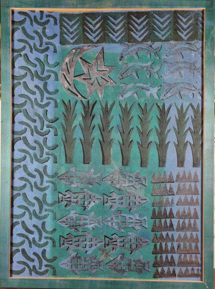 Dílo od autorky Krajčovičové v modro-zelených tónech. Umělkyně vytváří jednoduché repetitivní symboly, které vyplňují celou plochu plátna. Symboly volí z oblasti fauny a flory, celý výjev zasazuje do barvy připomínající moře, vodu. Motivy dokončuje jemným stínem po okraji, čímž vzniká v obraze prostorová rovina. Kombinovaná technika na textilii, rámováno pod sklem, rozměry s rámem 73,5 x 53,5 cm, rozměry díla 48,5 x 68 cm. Signováno uprostřed "Z.K."