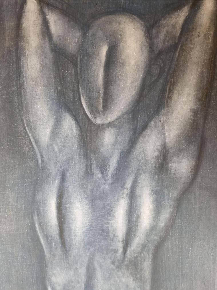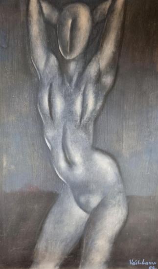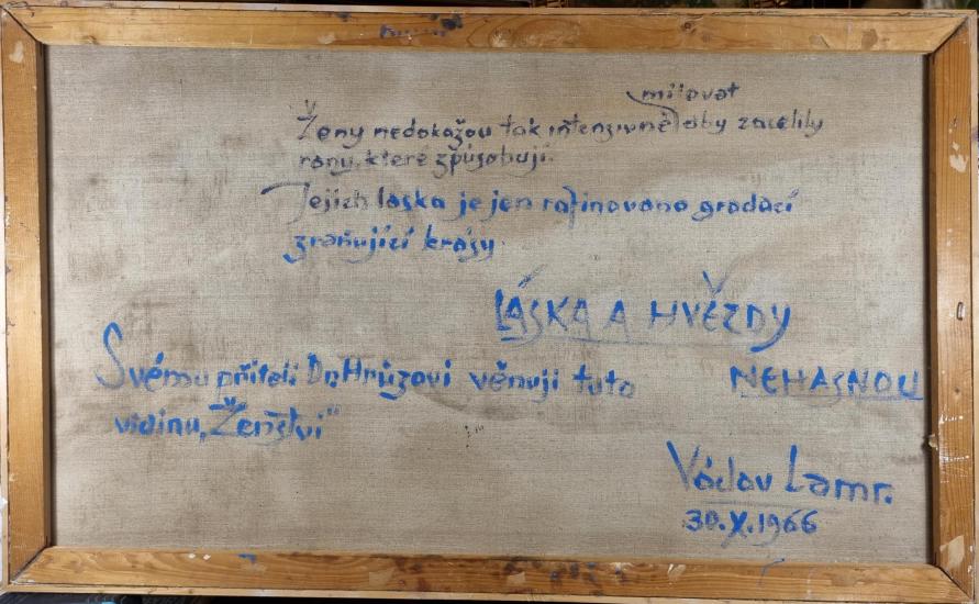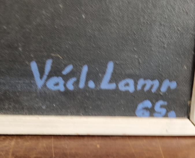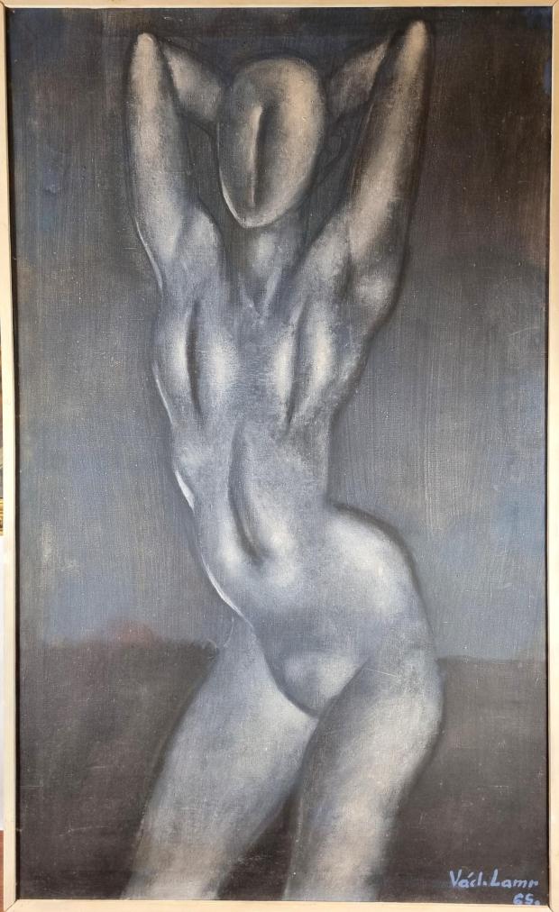 Malba v životní velikosti vyobrazující akt ženy způsobem, který zbavuje modelku osobnostních rysů a abstrahuje ji na podivné křivky, jako figurínu. Olej na plátně, zarámováno do bílého dřevěného rámu. Rozměry malby jsou 71 x 120 cm. Celkové rozměry s rámem jsou 75 x 122 cm. Signováno v rpavém dolním rohu Václ. Lamr, 65. Zadní strana je opatřeno autorským nápisem a věnováním, viz foto.