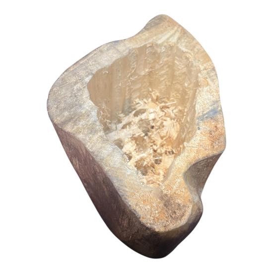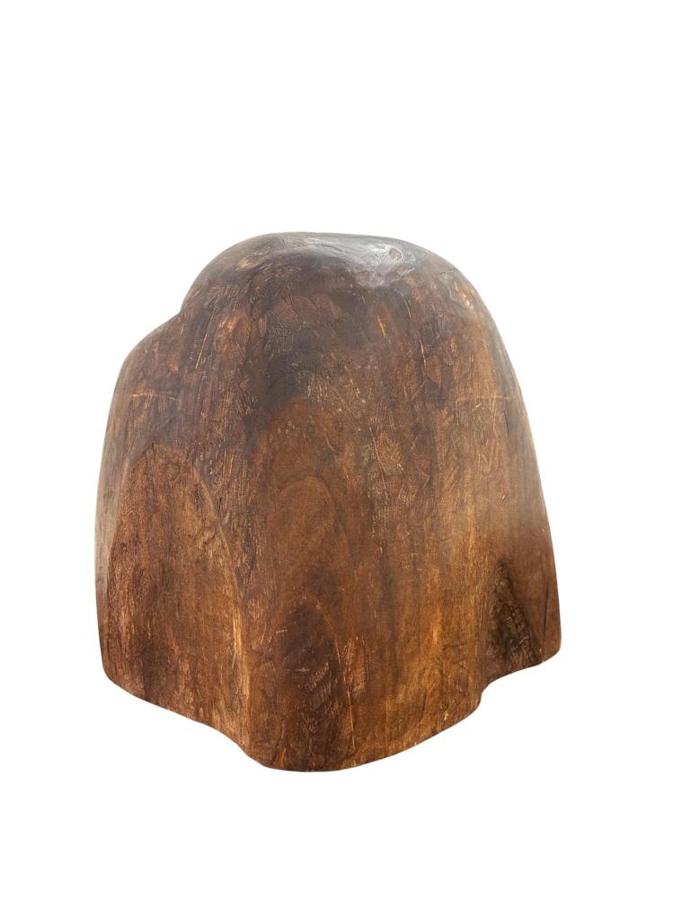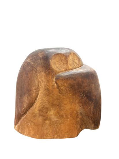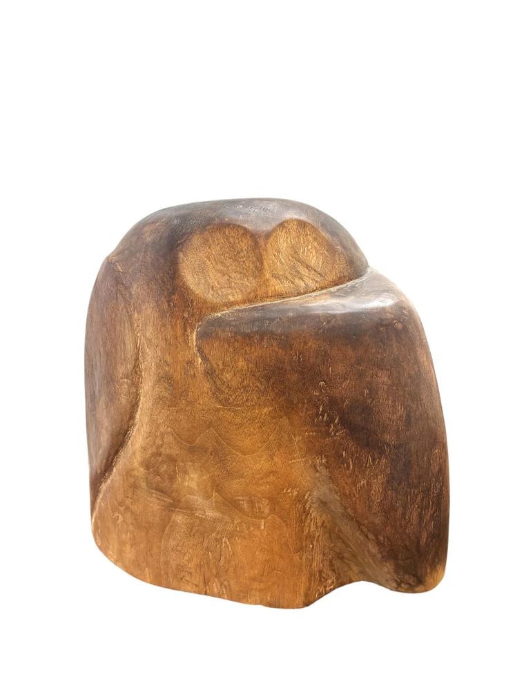 Dřevěná, ručně vyřezávaná socha z masivního kusu s několika detaily, které dotváří dojem sovy, částečně se ukrývající pod křídlem. Autor Zdeněk Macháček využívá původního tvaru a struktury materiálu, zasahuje pouze jemně, vyhlazuje povrch a nechává vyznít charakter dřeva. Celková výška je 26 cm, šířka je 29 cm. Hloubka plastiky je 17,5 cm. Plastika je vypracovaná do dutého tvaru, viz foto. Bez poškození. Neznačeno, nesignováno.