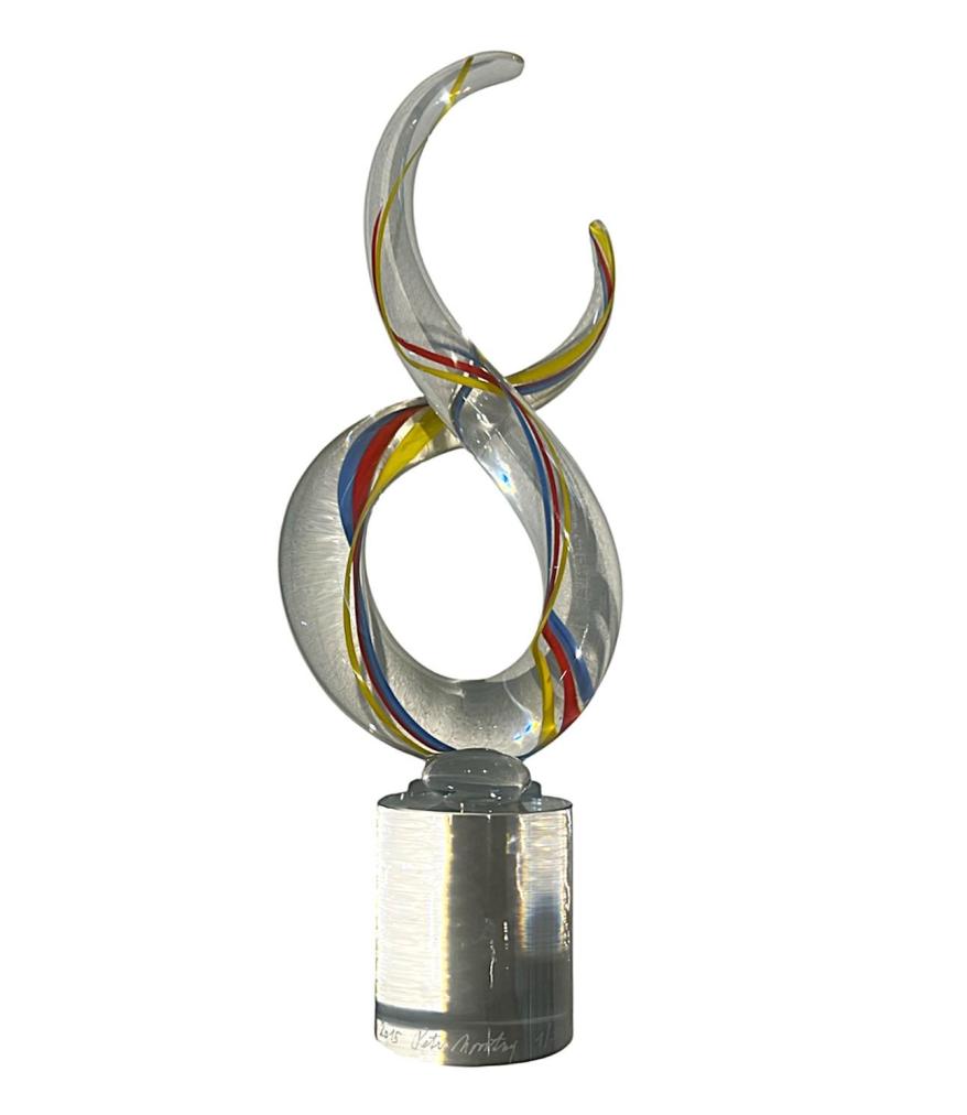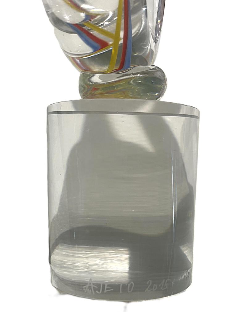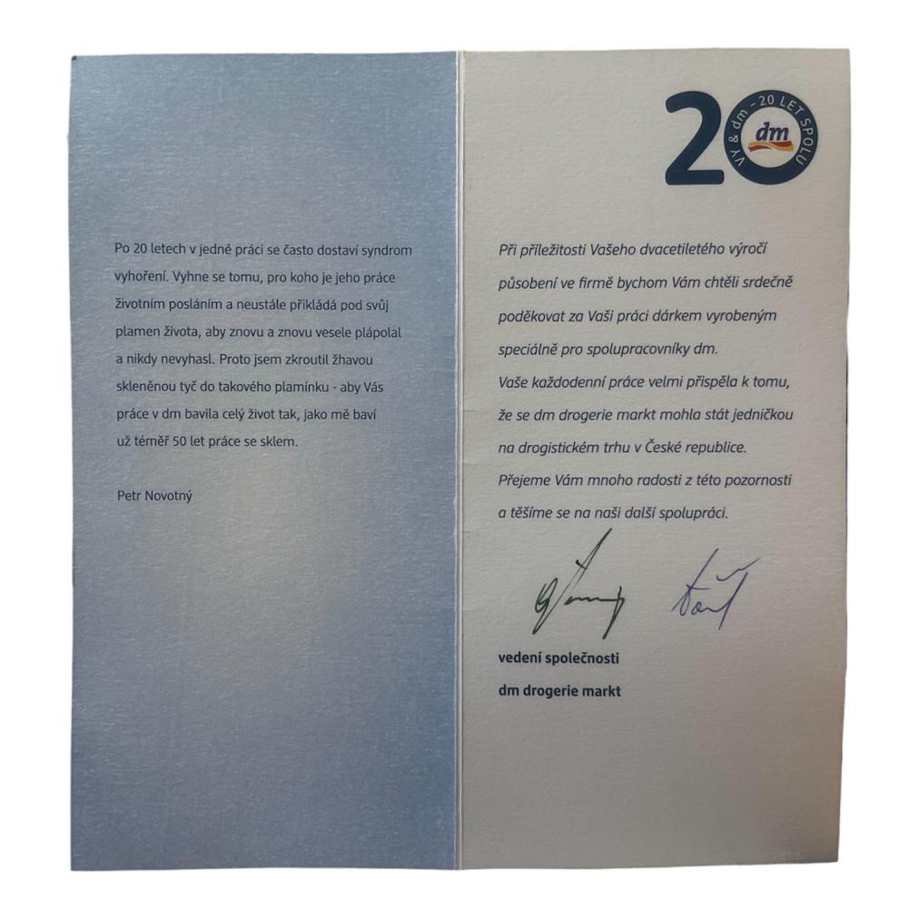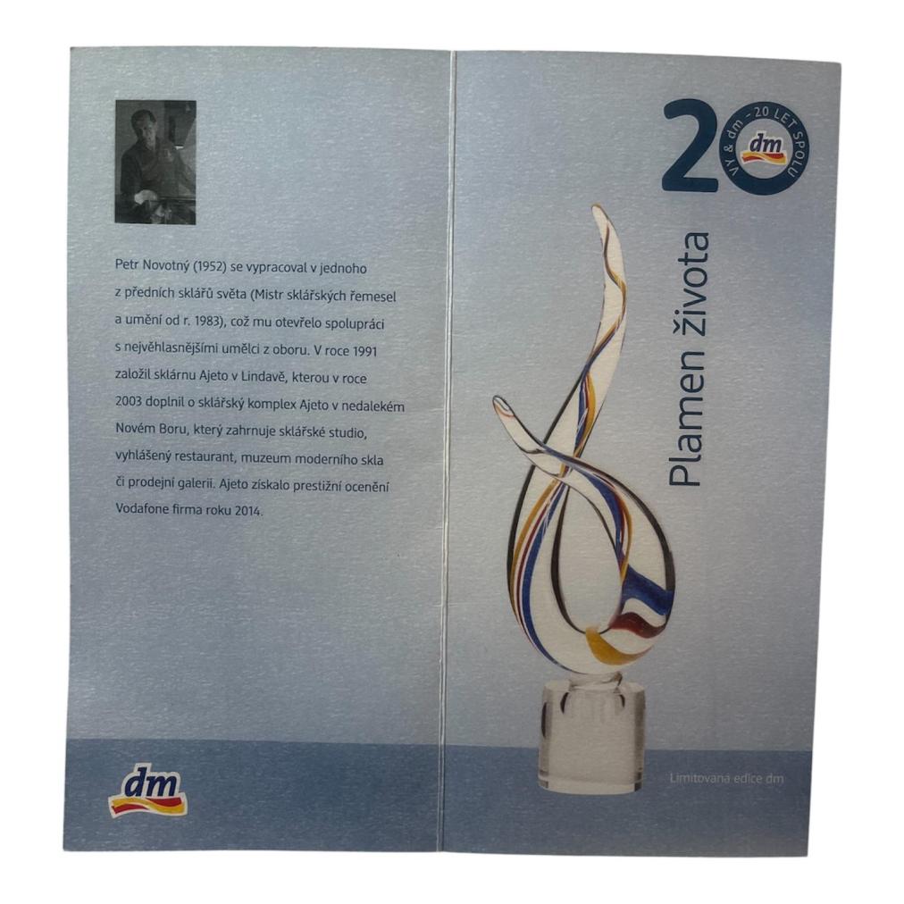 Tato skleněná plastika s názvem ´´ Plamen života´´ pochází z limitované edice vydané na počest dvacetileté spolupráce s firmou dm drogerie markt. Jejím autorem je sklář Petr Novotný ze sklárny Ajeto v Novém Boru. Autor do skleněného plamínku zakomponoval takové barvy, které zároveň korespondují s logem firmy. Plastika na výšku měří 36,5, na šířku 13 cm, hloubka je 7 cm. V perfektním stavu bez poškození. Signatura se nachází na podstavci- Ajeto 2015, Petr Novotný, viz foto.