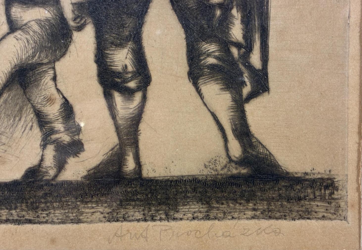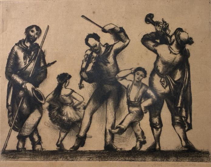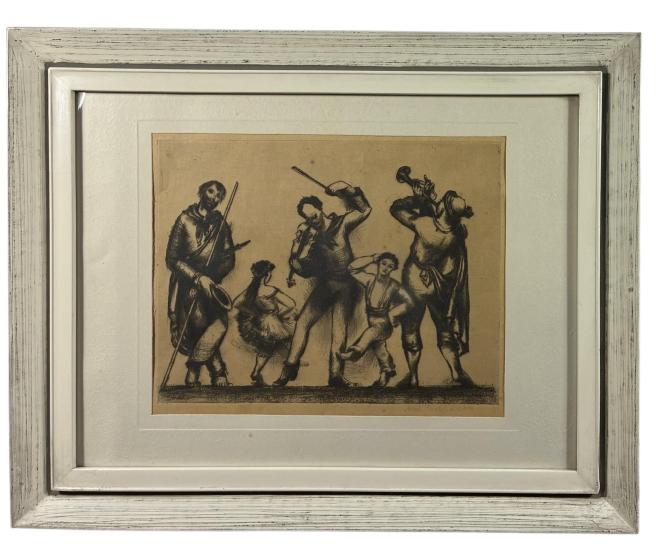 Příjemná grafika od Antonína Procházky. V díle jsou tři hudebníci a chlapec s dívkou, kteří tančí do jejich rytmu. Suchá jehla autorovi umožňuje vytvářet velmi syté plochy, které jsou tvořeny nejjemnějšími linkami a proto zároveň působí měkce. Suchá jehla na papíře, rámováno pod sklem, rozměry s rámem 49 x 38 cm, rozměry díla 27 x 20 cm. Signováno vpravo dole "Ant. Procházka".