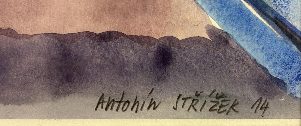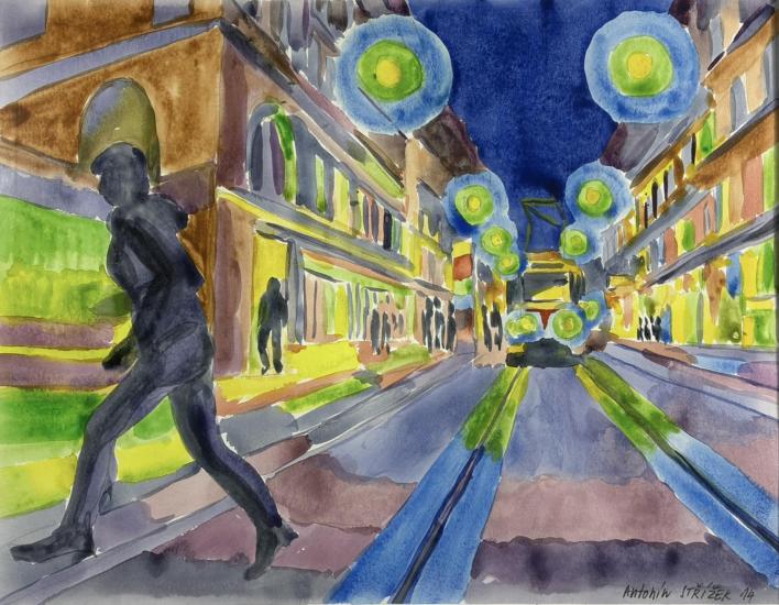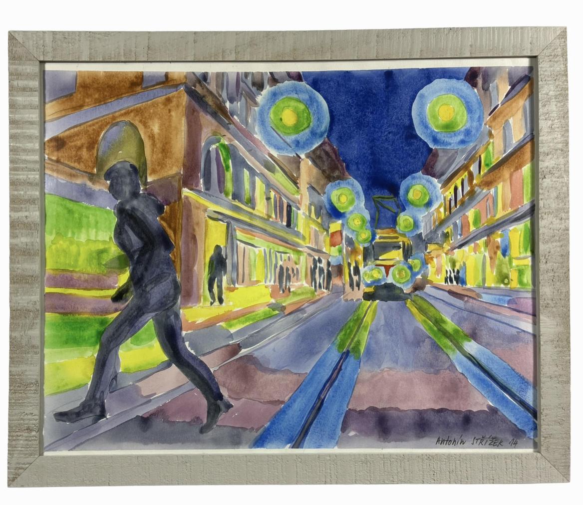 Fauvisticky pojatá maba, která se snaží o harmonizaci všech prvků. V popředí se nachází rychle kráčející postava a v pozadí poblykává městský život. Akvarel na papíře namaloval Antonín Střížek jehož signováno Antoní Střížek 14 . Malba je pod sklem. Rozměry obrazu s rámem jsou 55 cm x 44 cm a bez rámu 48 cm x 38 cm.