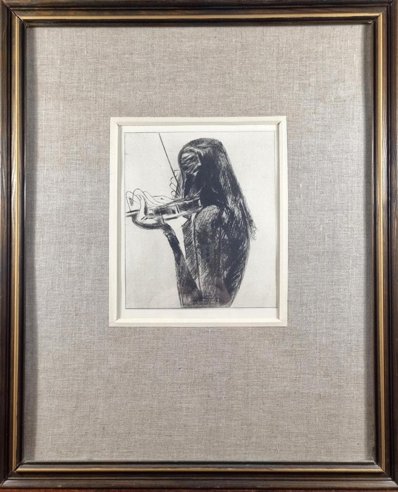 Grafika od Františka Tichého. Pro tohoto autora jsou typické náměty se silným nábojem, zde vidíme postavu Paganiniho, kterou halí černá barva. Pouze dlaně nechává autor vyznít v kontuře, jinak klade linky přes sebe a zhuštěním vytváří skvělou kontrastní hloubku v díle. Suchá jehla na papíře, rámováno pod sklem, rozměry s rámem 54 x 45 cm, rozměry díla 20 x 17 cm. Nesignováno.