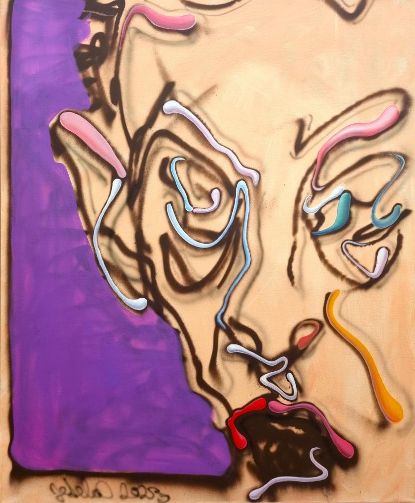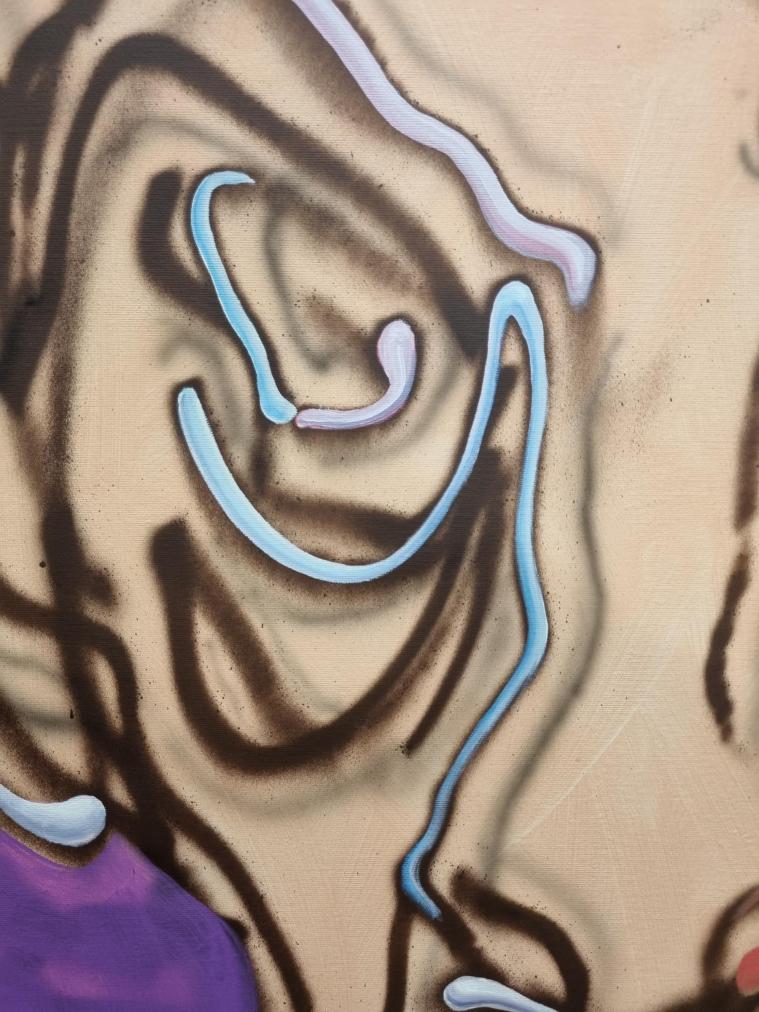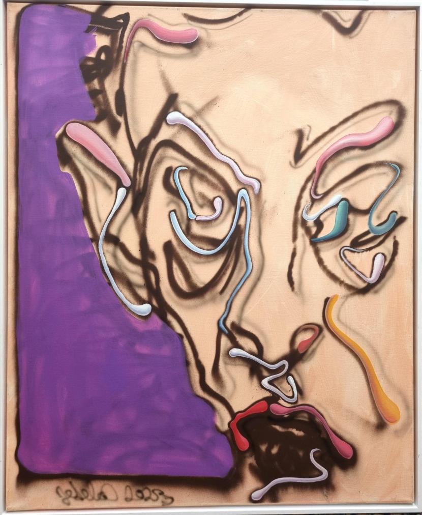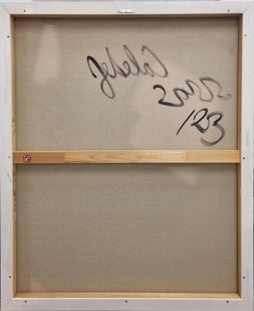 Autor Tomáš Jetela, kombinovaná technika na plátně, rámováno, rozměry s rámem 113 x 93 cm, rozměry díla 110 x 90 cm, rok 2022/23. Signováno vlevo dole i ze zadní strany obrazu.