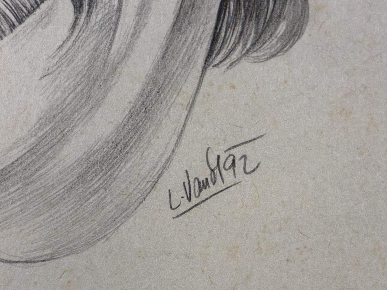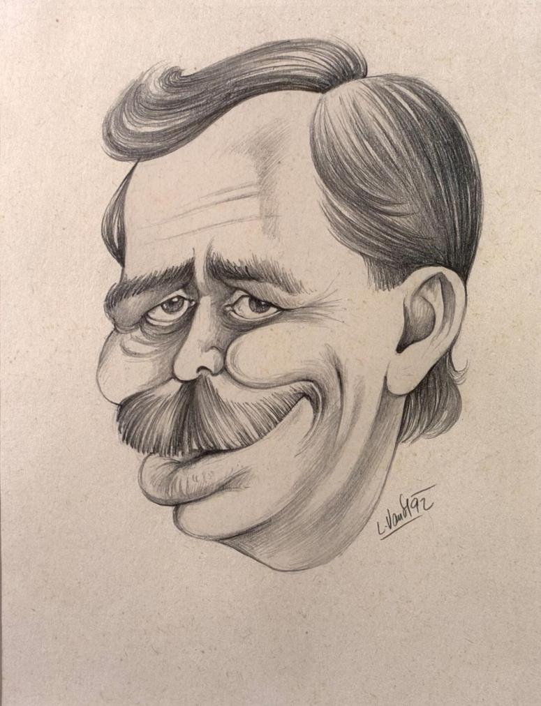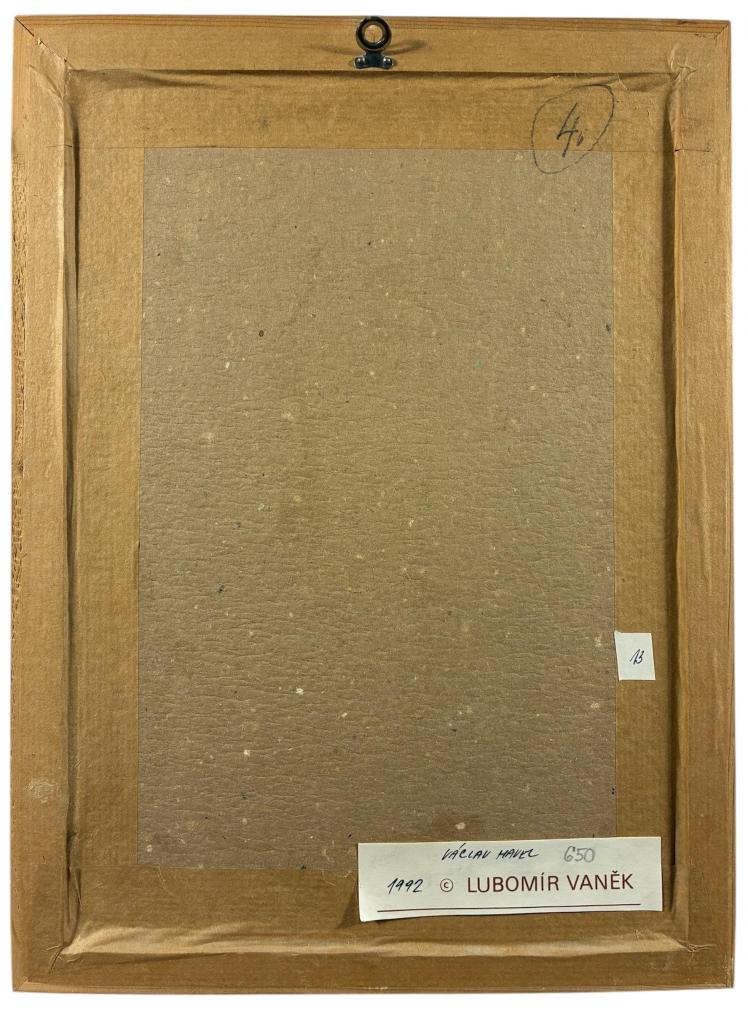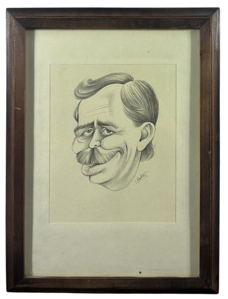 Portrét od slavného karikaturisty Lubomíra Vaňka. V tomto díle portrétuje bývalého českého prezidenta Václava Havla. Smyslem karikatury je hbitě vystihnout základní rysy člověka a upravit podobiznu vtipným způsobem, především prostředníctvím předimenzování některých částí. Tužka na papíře, rámováno pod sklem, rozměry s rámem 33 x 24 cm, rozměry díla 18 x 14 cm. SIgnováno ve spodní pravé části "L. Vaněk 92".