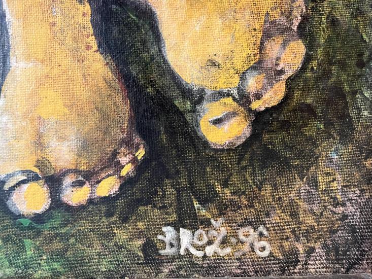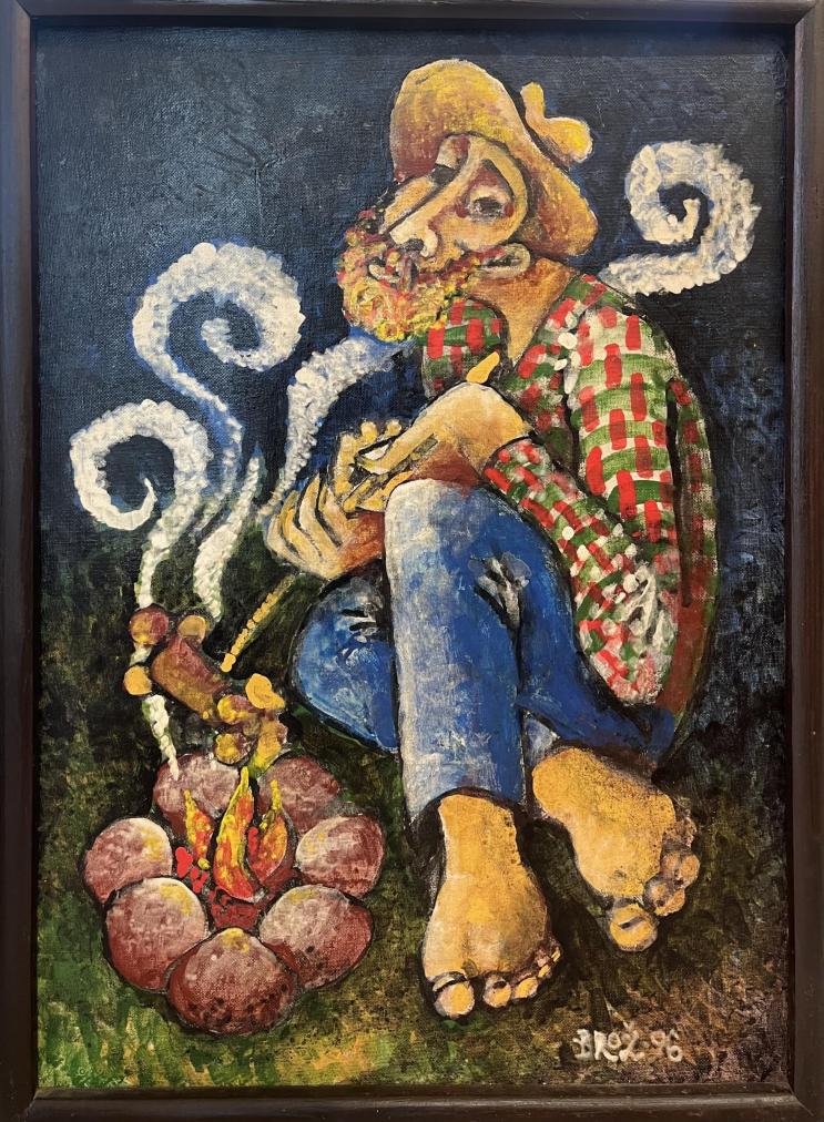 Malba od autora Jana Brože. Autor vyplňuje celý formát obrazu motivem muže v klobouku, který se krčí u ohně a opéká si buřt. Brož pojímá námět s lehkostí a nechává ho vyznít pohádkově, dílo působí jako ilustrace z dětské knihy. V temné noci vyniká barevný vzor košile, kouř linoucí se z ohně či mužova tvář. Olej na lepence, rámováno, rozměry s rámem 73 x 53 cm, rozměry díla 68 x 48 cm. Signováno vpravo dole "Brož 96".