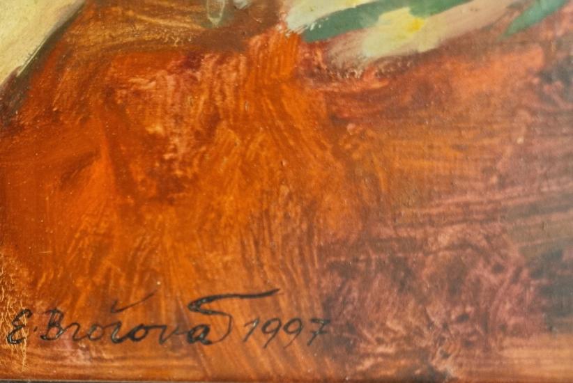 Skvělé dílo od malířky Evy Brožové, kde se setkává autorčin oblíbený motiv intelektuálně vyhlížející dívky s chytrýma očima a abstraktní krajiny v teplých uklidňujících tónech. Dílo má podlouhlý atypický formát a vyobrazuje akt ležící dívky, která působí díky ve své majestátnosti a uhrančivému pohledu jako Sfinga strážící poklad. Olej na sololitu, zarámováno do hnědého dřevěného rámu. Rozměry malby jsou 53 x 88 cm. Rozměry s rámem jsou 58 x 94 cm. Signatura se nachází na pravé straně dole E. Brožová 1997.