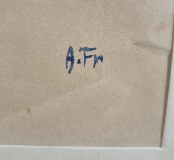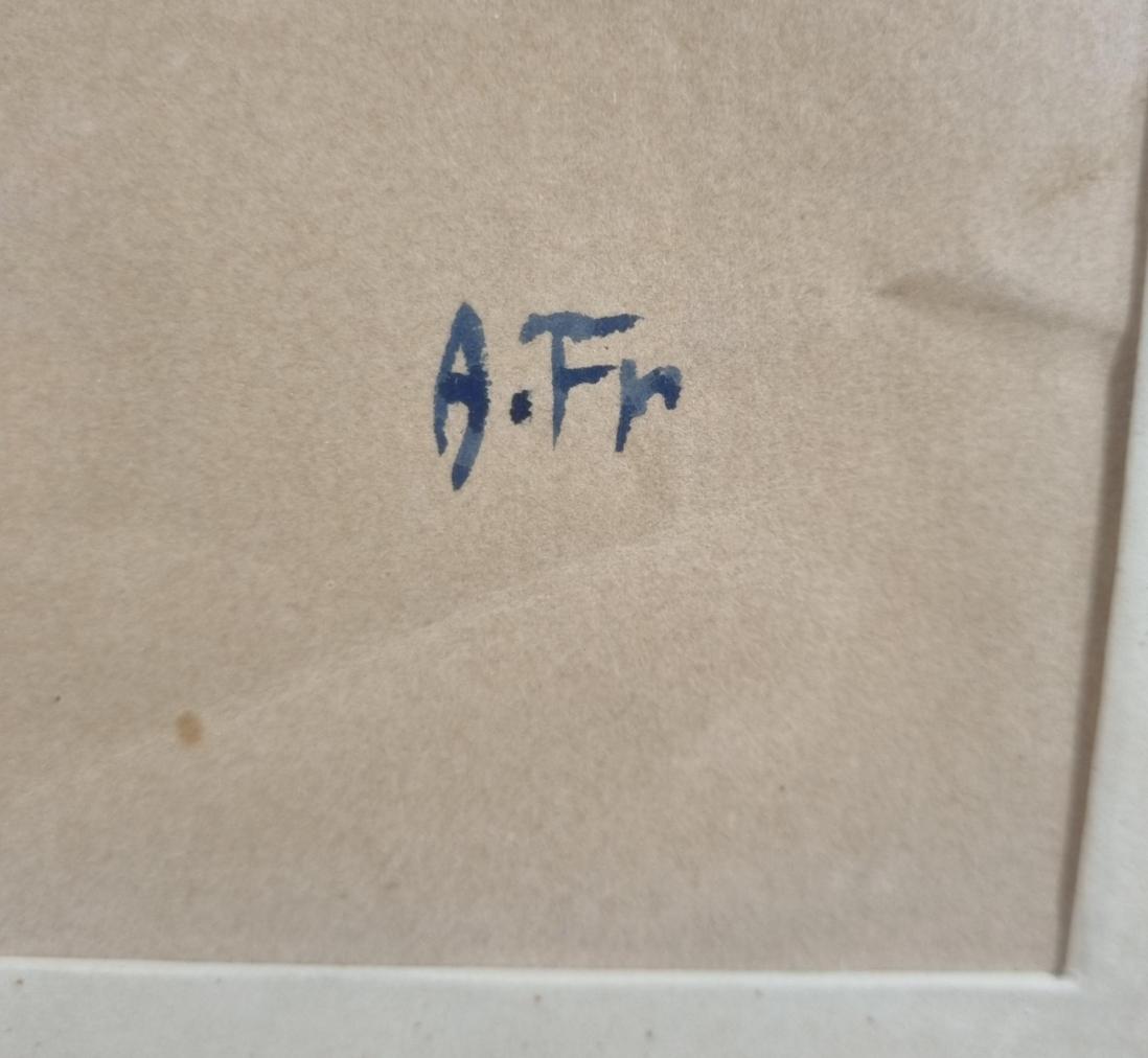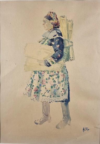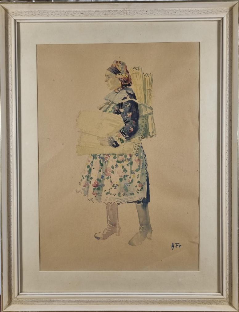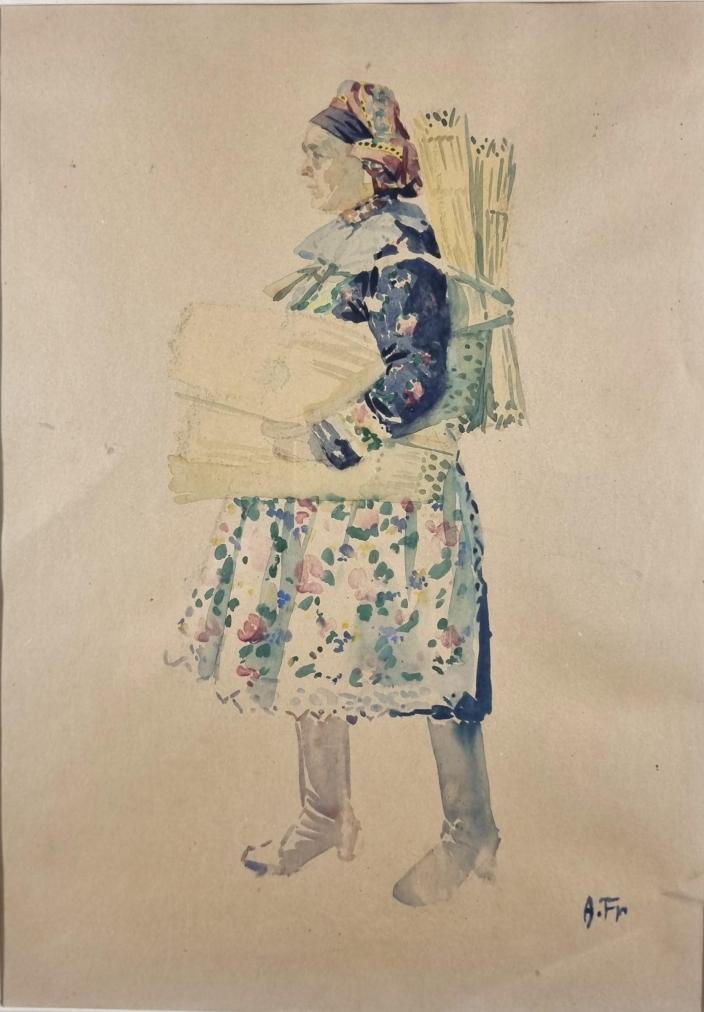 Krásná akvarelová malba krojované ženy, která hledí vpřed. Umělec za pomocí jemných akvarelových ploch vytváří gradienty barev, které se mísí a společně vytvářejí krásný obraz lidového kroje. Kroj je hojně zdobený kvítky a je v obraze dominantní, zbytek díla umělec zanechává v čistotě a jednoduchosti. Akvarel na papíře pod sklem, rozměry s rámem 62 x 48 cm, rozměry díla 47 x 33 cm. Signováno dole "A. Fr".