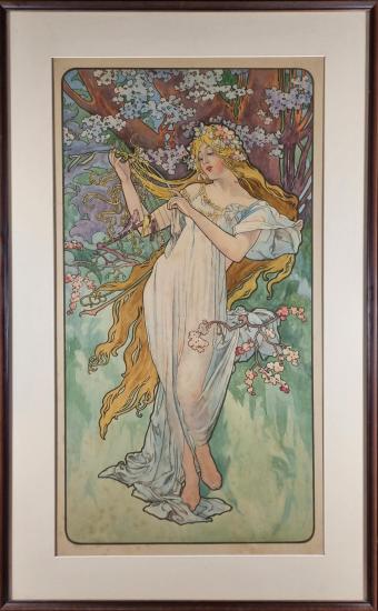 Kopie slavného obrazu z cyklu ročních období od Alfonse Muchy. Mucha vytvářel výsostně secesní díla, využíval tedy především vizuální jazyk spojený s ornamentem, který čerpá s tvarů a forem nacházejících se v přírodě. To propojuje s ženskými postavami a hledá paralely. Akvarel na papíře, rámováno pod sklem, rozměry s rámem 103 x 64 cm, rozměry díla 80 x 42 cm. Nesignováno.