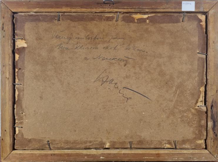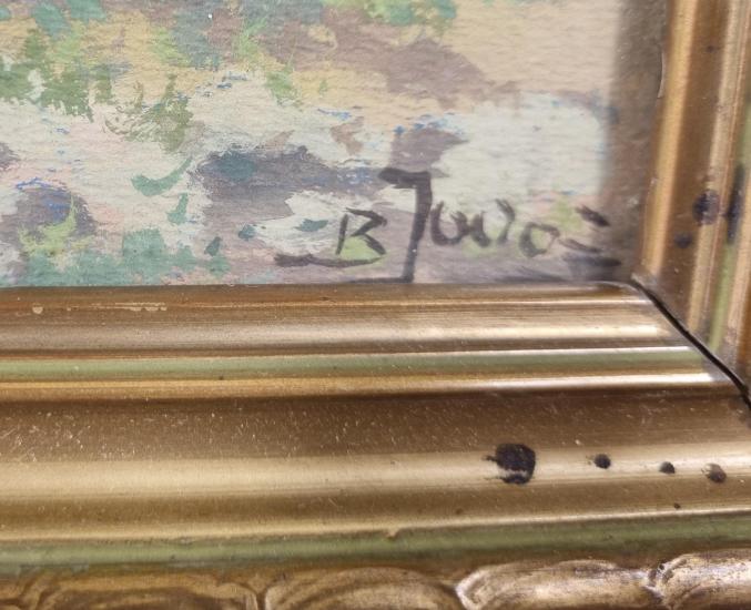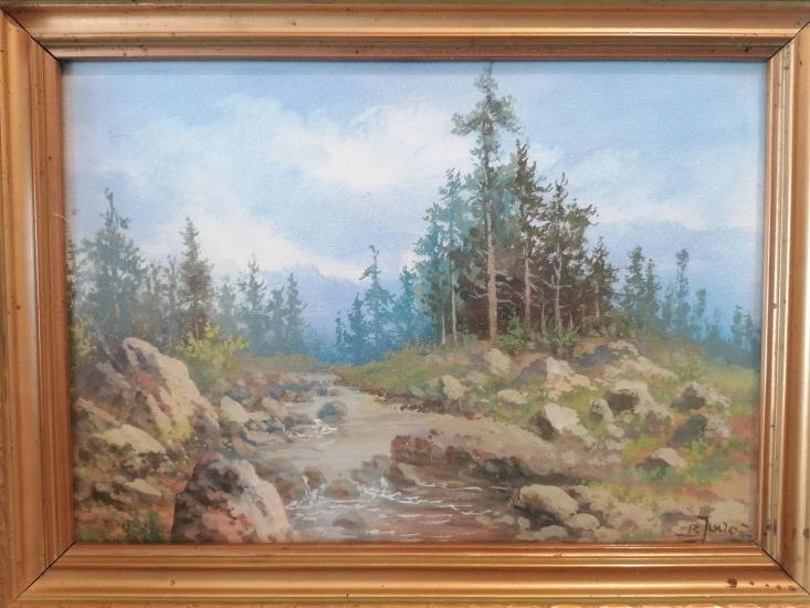 Drobná malba od autora Jaroše, která nám nabízí pohled do vrcholnaté lesní krajiny. V díle převládá nádherný odstín modré oblohy, který rámuje celou scenérii. Vpředu se čeří potůček, který září svými odlesky. Všude kolem se tyčí kameny porostlé mechem. Olej na dřevě, rámováno pod sklem, rozměry s rámem 39 x 29 cm, rozměry díla 32 x 22 cm. Signováno vpravo dole "B. Jaroš".