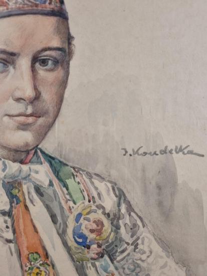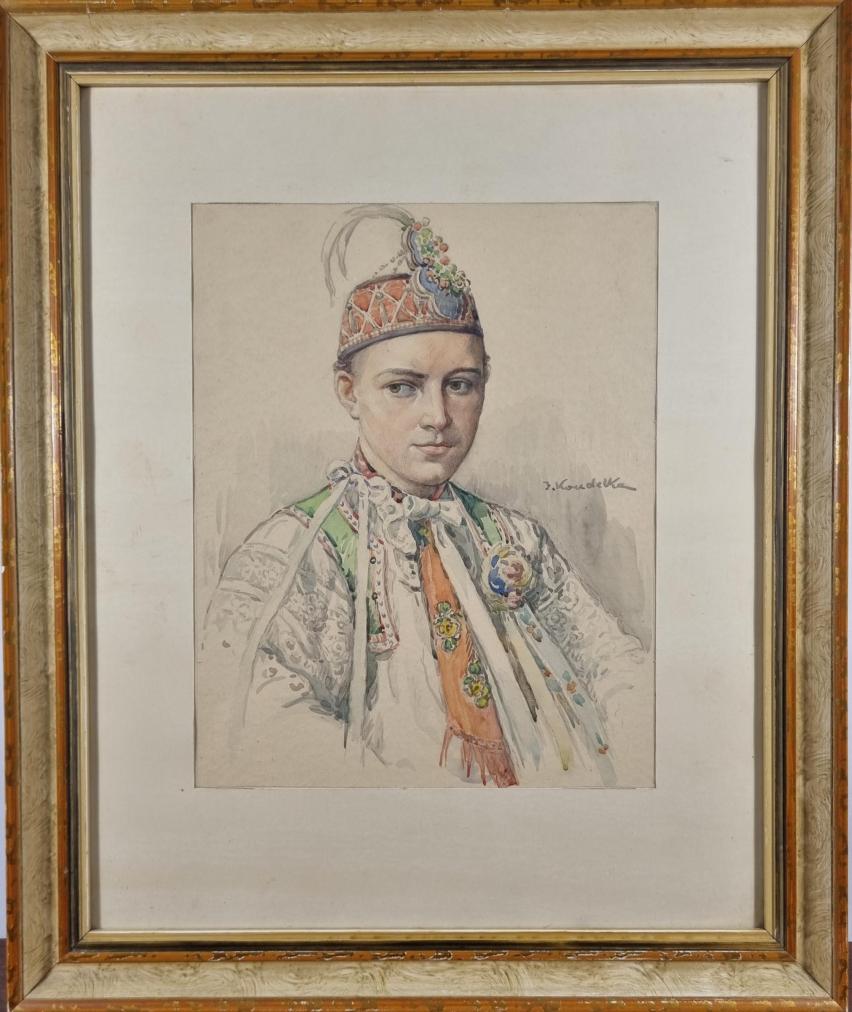 Typické dílo pro autora Jožu Koudelku. Námětem se mu tentokrát stal mladík v kroji, pozornost upoutá především zdobnost folklórního oblečku. Chlapcův čepec je plný nádherných detailů, Koudelka použil zářivě světlý odstín zelené barvy, který zaujme na první pohled. Akvarel na papíře pod sklem, rozměry s rámem 57 x 47 cm, rozměry díla 34 x 27 cm. Signováno vpravo uprostřed "J. Koudelka".