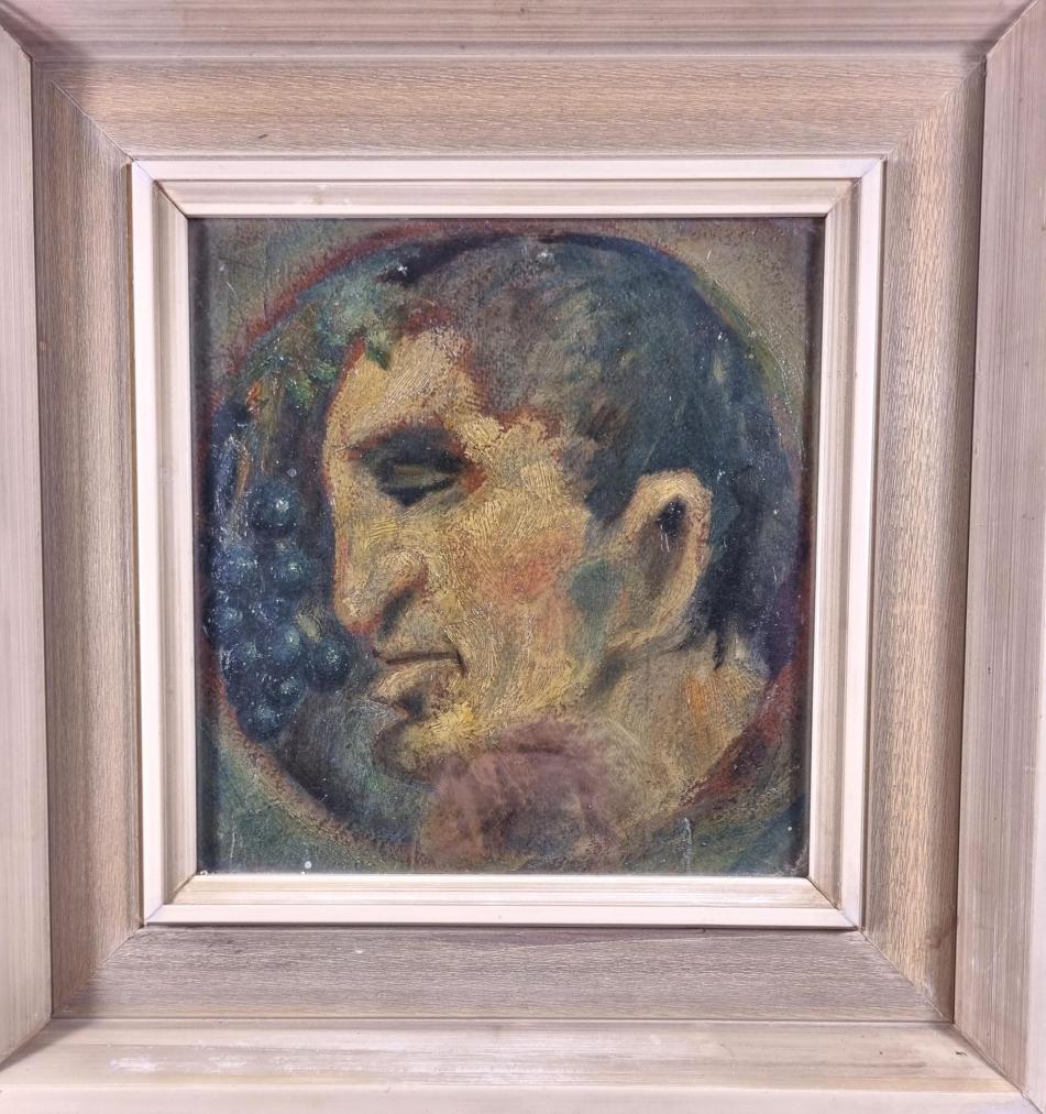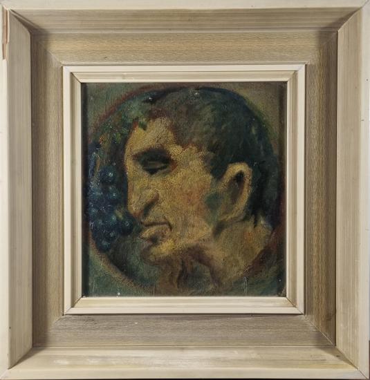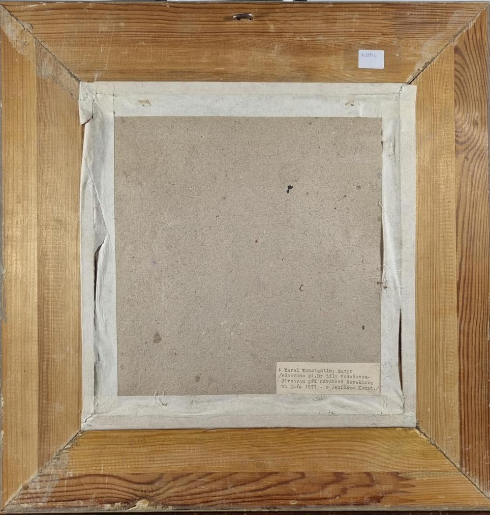 Skvělá malba s motivem hlavy satyra. Malba je na první pohled hutná, je patrné, že je tvořena silnými nánosy a je místy lehce plastická, umělec zdůrazňuje tvar trsu hroznů po boku a ty působí, jako by z díla lehce vystupovaly. Satyr má charakteristický zjev, hrubou tvář doplňuje dlouhý vous a celá malba je zahalena do zemitých tónů. Olej na desce, rámováno pod sklem, rozměry s rámem 44 x 43 cm, rozměry díla 25 x 24 cm. Nesignováno. Vzadu je autorský štítek: "Karel Konstantin: Satyr. Věnováno pí. Dr. Hodačovou-Jirsovou při návštěvě Neveklova na jaře 1971 - s Jeníčkem Konst.".