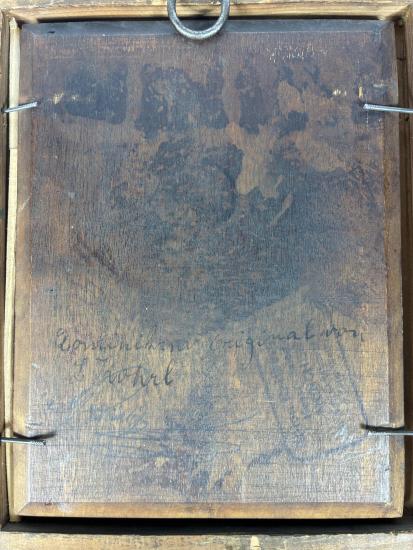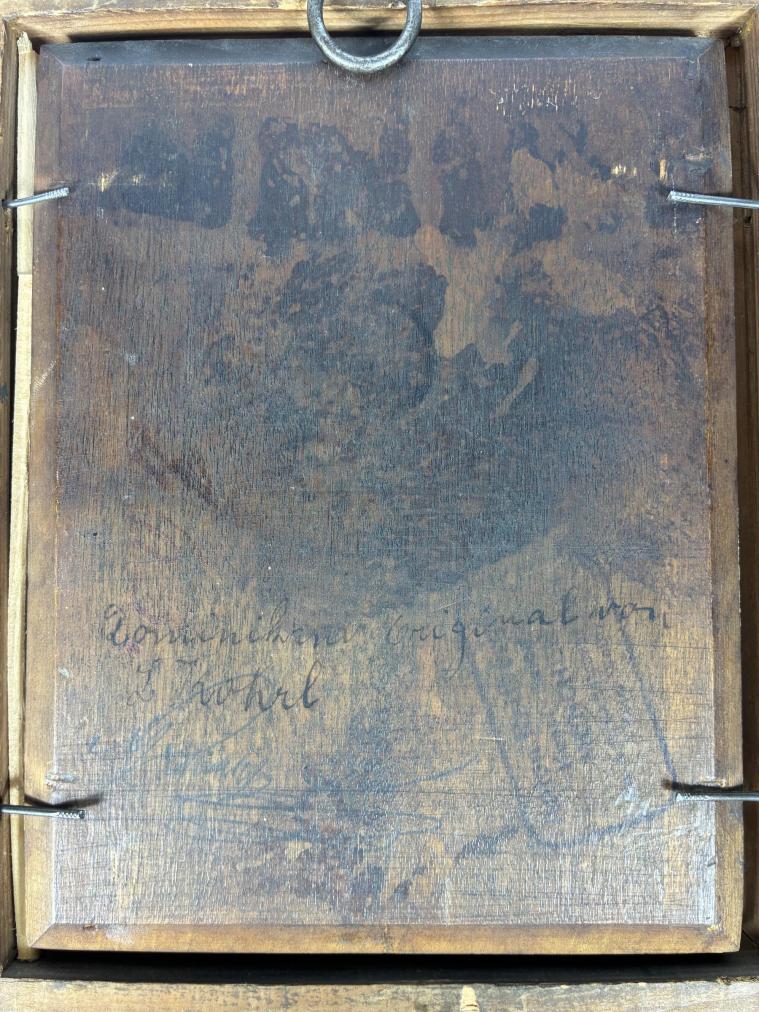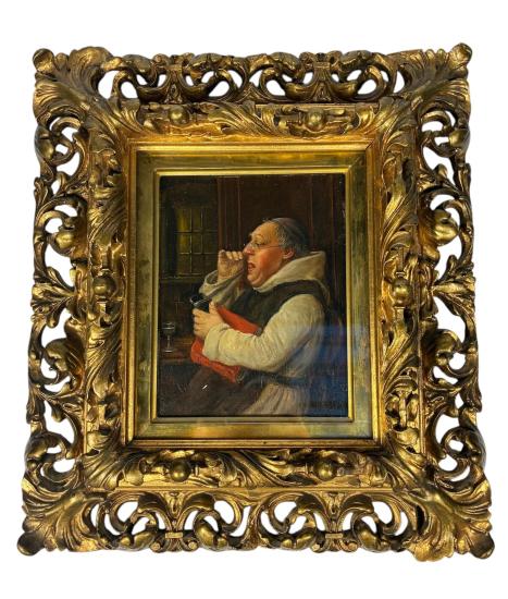 Obraz ze série mnichů od německého malíře Ludvíka Kohrla. Na obraze vidíme mnicha držícího červenou knihu a šňupe tabák. Jedná se o olejomalbu na dřevě v ručně řezaném zlaceném rámu. Velikost s rámem je 35 x 31 cm,dřevěná deska 18 cm x 14 cm. Signatura je na zadní straně Münch L. Kohrl.