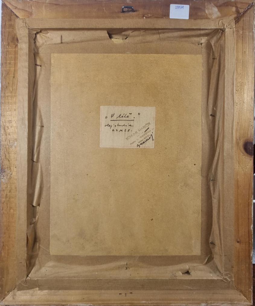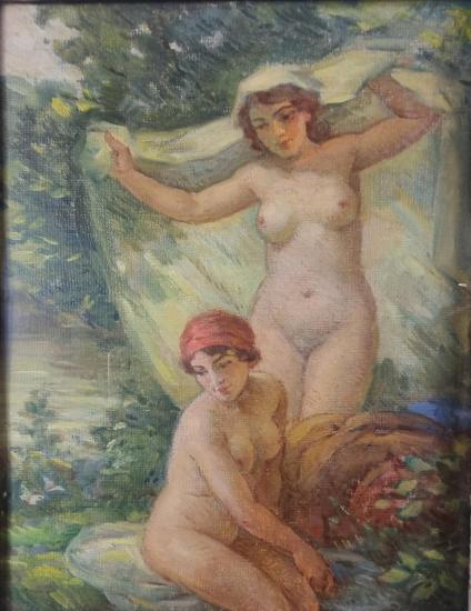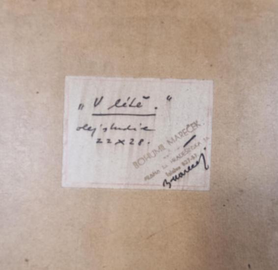 Skvělá malba menšího formátu od autora Marečka s námětem letního odpoledne a dvou žen, které zrovna vylezly z rybníku. Umělec vytváří nevinnou studijní malbu, věnuje pozorost jemným detailům ženského těla v obklopení přírody. Krásným momentem se stává osuška, která působí jako závoj a vytváří magický prvek v díle. Olej na sololitu, rámováno pod sklem, rozměry s rámem 35 x 29 cm, rozměry díla 20 x 26 cm. Signováno vpravo dole "B. Mareček".