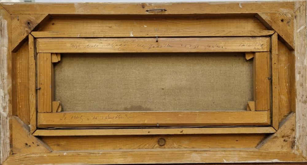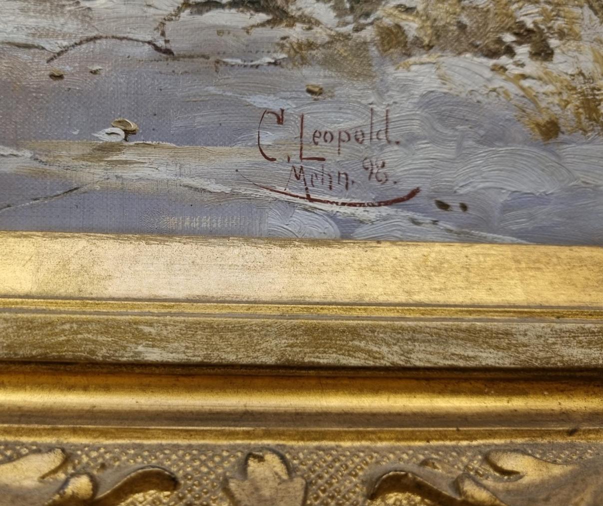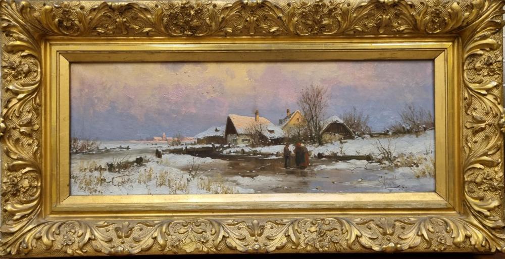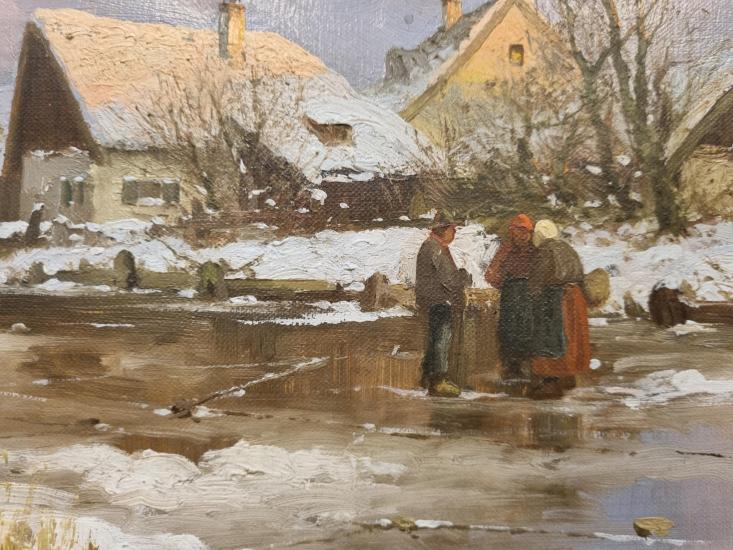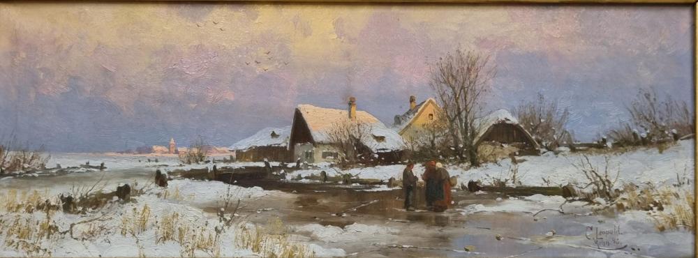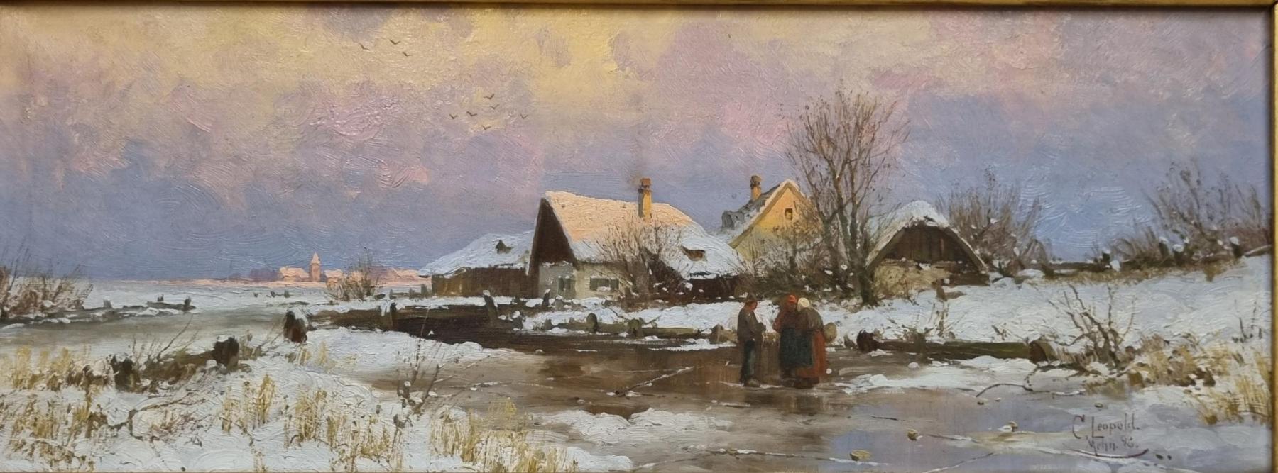 Malba podlouhlého formátu od autora Carla Leopolda Mehna. Autor zachycuje autentickou zimní atmosféru, do centra obrazu staví chaloupky nasvícené nádherným odstínem zapadajícího slunce. Právě světlo v tomto díle dominuje a vytváří kouzelnou atmosféru. Olej na plátně, rámováno, rozměry s rámem 76 x 40 cm, rozměry díla 57 x 21 cm. Signováno vpravo dole "C. Leopold Mehn 98".