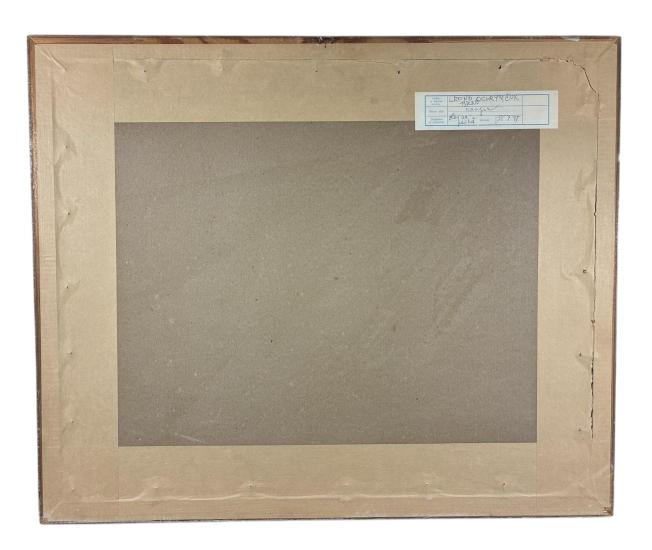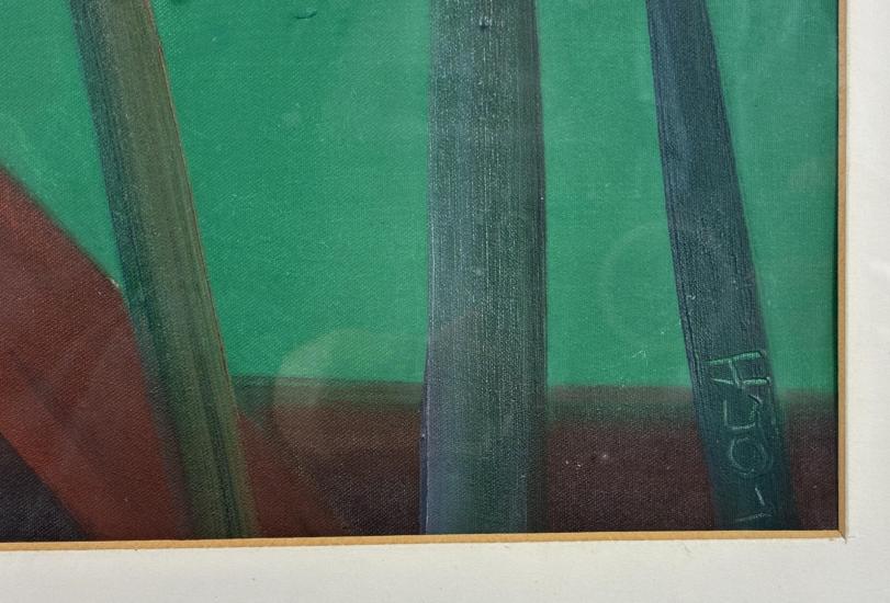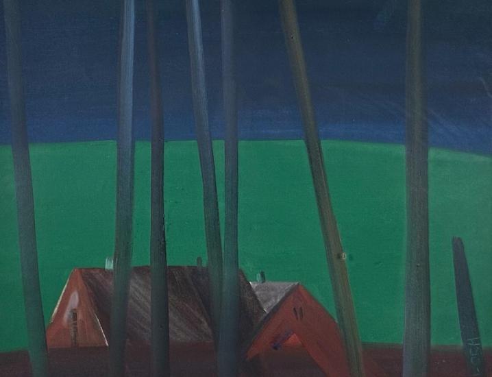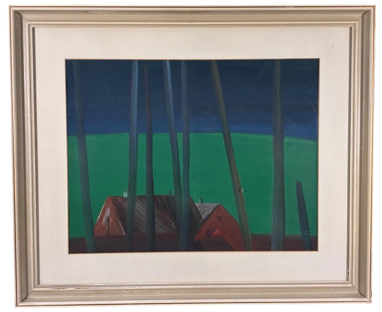 Malba českého akademického malíře Leonida Ochrymčuka, jejímž hlavním motivem se stávají červeně zbarvené domy na pozadí výrazné louky. Zelená plocha ostrým přechodem končí a mění se v sytě modré nebe. Obraz protínají úzké tmavé linie. Olej na papíře, zarámováno, pod sklem. Paspartováno. Rozměry malby jsou 44 x 34 cm. Rozměry s rámem jsou 63 x 52 cm. Signatura se nachází na pravé straně dole: L. OCH. Ze zadní strany obrazu je nalepen autorský štítek s názvem díla. Pravý dolní roh rámu má menší oťuk, díky kterému nejspíš vzniklo i uštípnutí skla, viz foto.