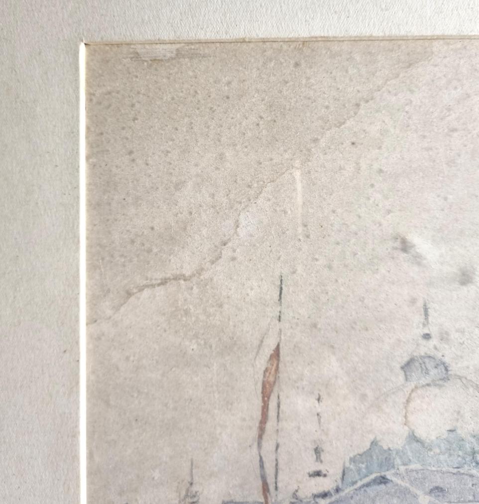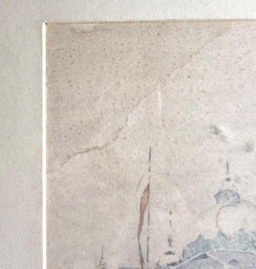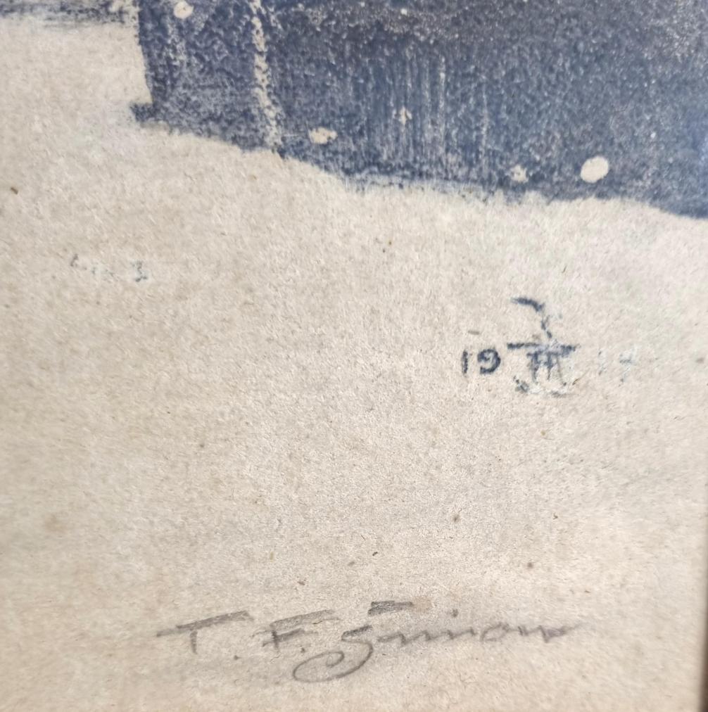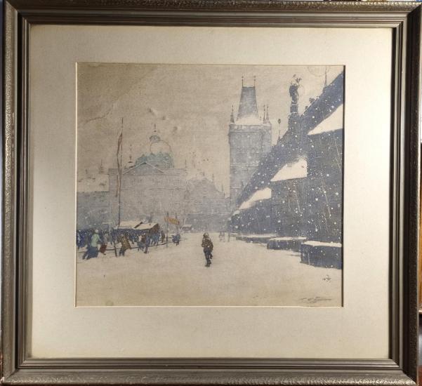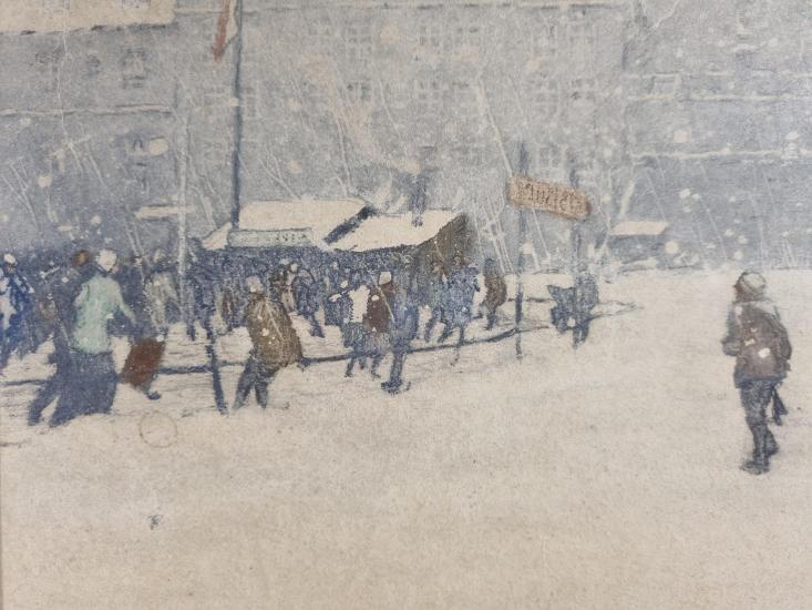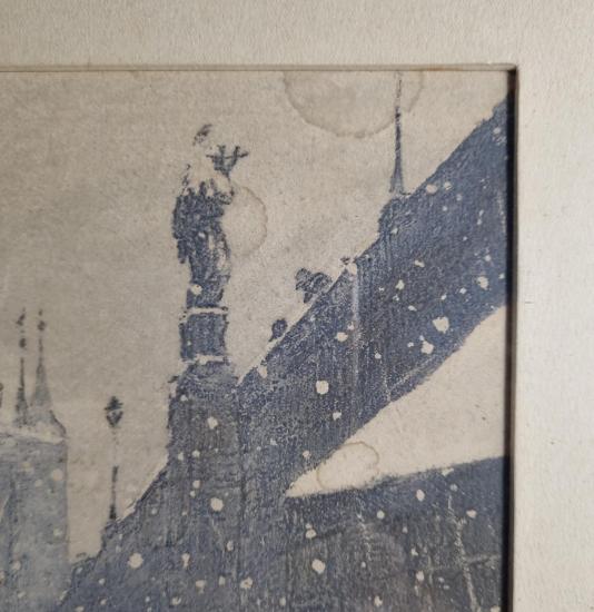 Jemné dílo od Františka Šimona Tavíka s převládajícími prvky bílé a lehkými náznaky barev. Autor skvěle vystihuje sněhovou mlhu, která brání vidění ostrých detailů. Hlavním motivem jsou zde děti a dospělí, kteří si užívají zimní radovánky. Tónovaný/kolorovaný lept na papíře. Zarámováno, pod sklem. Paspartováno. Rozměry díla jsou 38 x 34 cm, celkové rozměry s rámem jsou 57,5 x 53 cm. Signatura se nachází na pravé straně dole T.F. Šimon 1975. V obou horních rozích se v obrazu nachází skvrny viz foto.