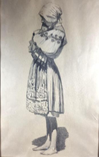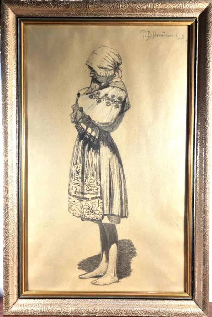 Signovaná detailní kresba dívky monogramem JU provedena uhlem na papíře. Vnitřní strana rámu se skládá ze zlaté, zelené a černé barvy. Celý obraz je zarámovaný a schovaný pod sklem. Vnější strana rámu je též zlaté barvy a je struktuovaná.. Rozměry obrazu i s rámem jsou 66 cm x 44 cm.
