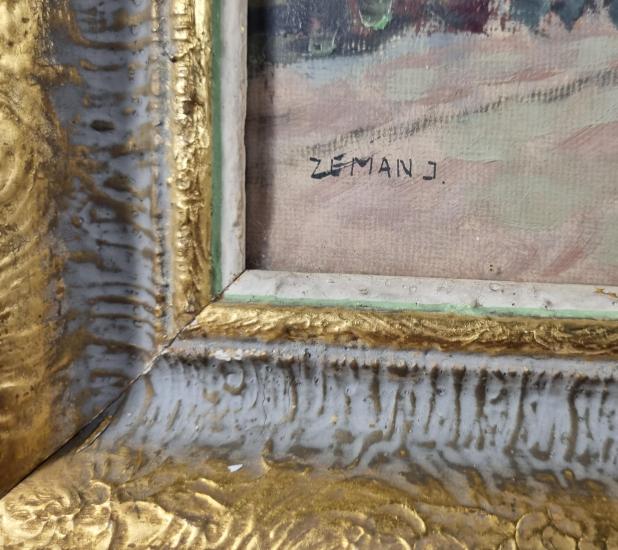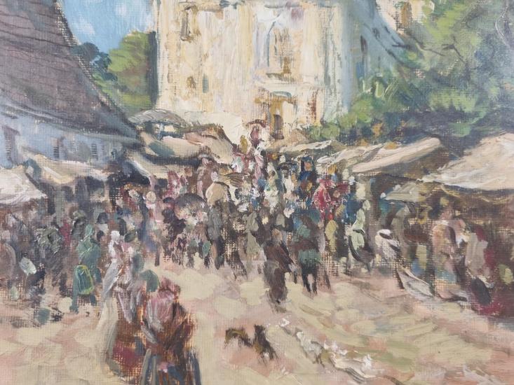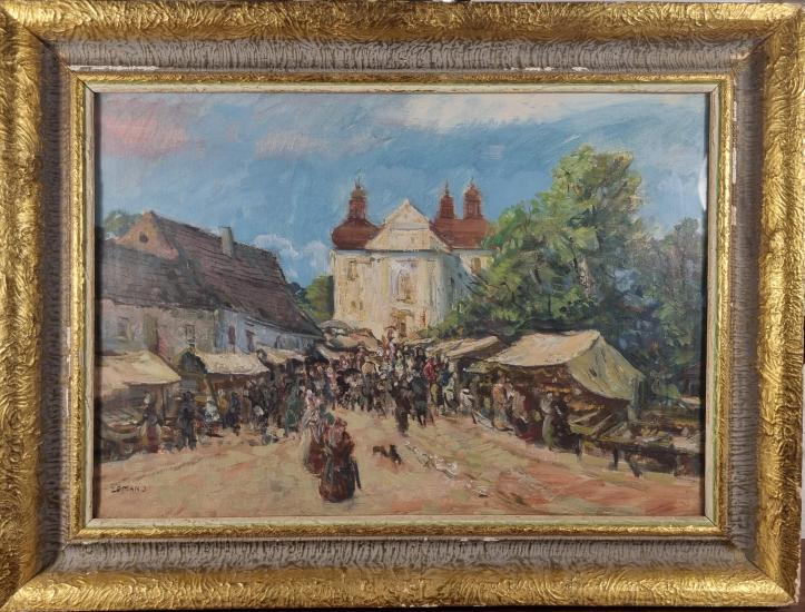 Malba s námětem pohledu do městečka či vesnice, kde se konají trhy. V díle se rozprostírá náměstí, které vede ke kostelu a je poseto davem lidí, kteří zde postávají, nakupují a druží se. Při pohledu zblízka vidíme, že výjev je tvořen skvrnami, tečkami a neuhlazenými tahy štetce za pomocí vysokého nánosu barvy. Olej na plátně podloženém dřevem, rámováno pod sklem, rozměry s rámem 59 x 45 cm, rozměry díla 47 x 33 cm. Signováno vlevo dole "Zeman J.".