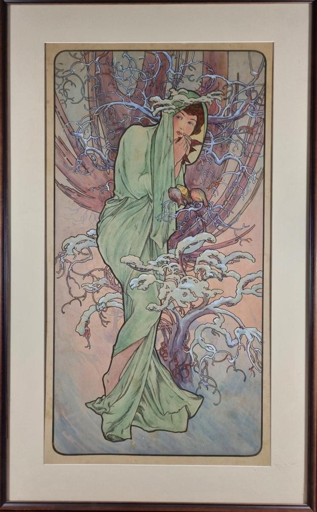 Kopie slavného obrazu z cyklu ročních období od Alfonse Muchy. Mucha vytvářel výsostně secesní díla, využíval tedy především vizuální jazyk spojený s ornamentem, který čerpá s tvarů a forem nacházejících se v přírodě. To propojuje s ženskými postavami a hledá paralely. Akvarel na papíře, rámováno pod sklem, rozměry s rámem 103 x 64 cm, rozměry díla 80 x 42 cm. Nesignováno.