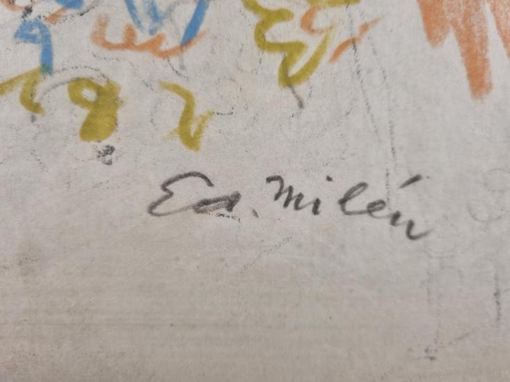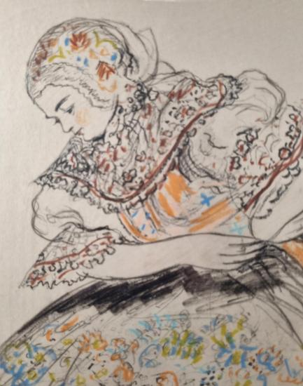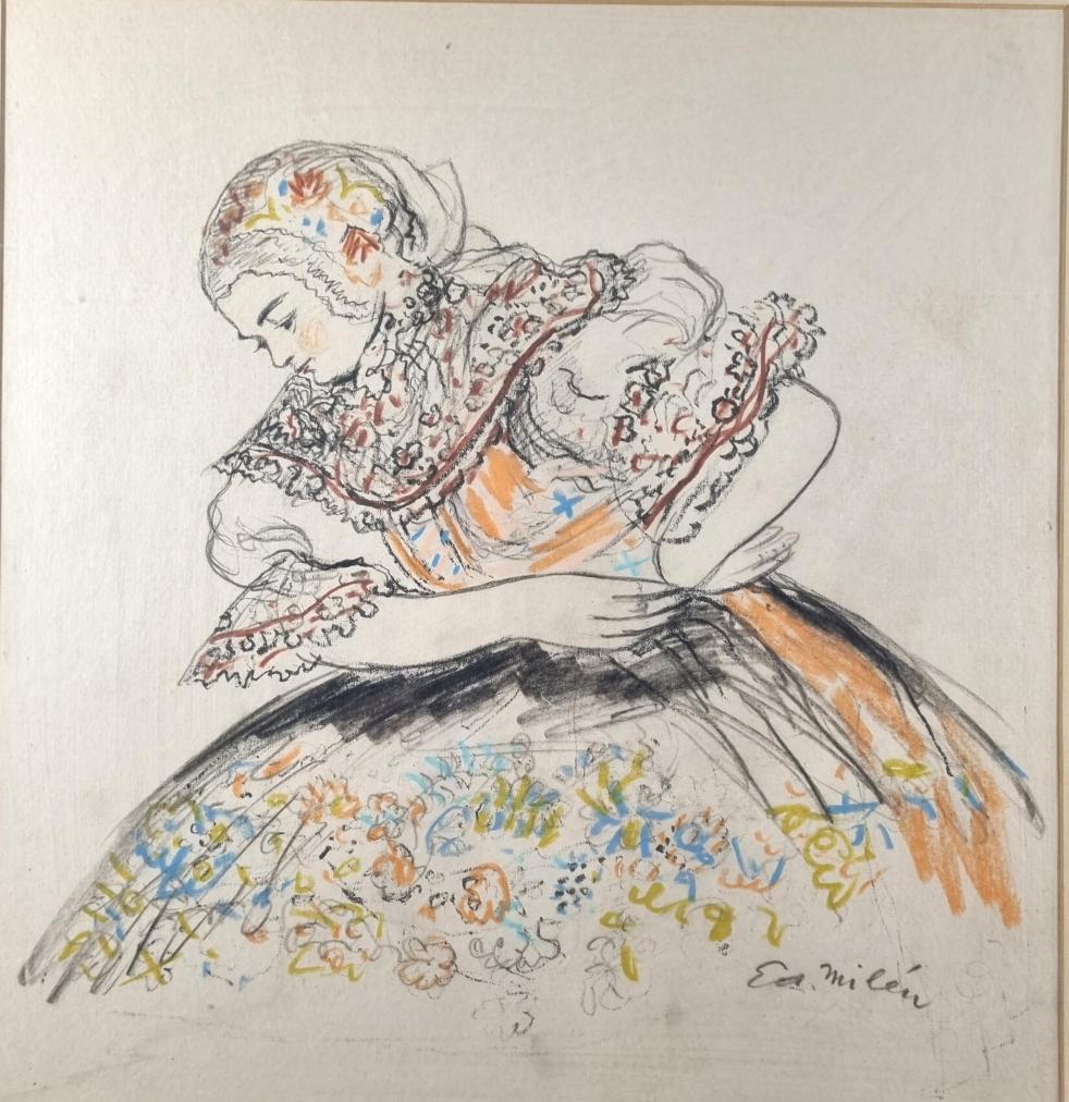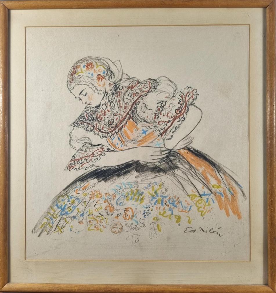 Dílo od Eduarda Miléna s námětem ženy v kroji. Dílo je oslavou folkloru, autor zaměřuje veškerou pozonost na kroj, který srší barvami a folklorním ornamentem. Kresba je dynamická, umělec dokázal zachytit pohyb ženy v tanci. Kombinací černé linky a pestrého zdobení vzniká krásná, jednoduchá kresba. Kresba na papíře, rámováno pod sklem, rozměry s rámem 45 x 42 cm, rozměry díla 36 x 34 cm. Signováno vpravo dole "Ed. Milén".