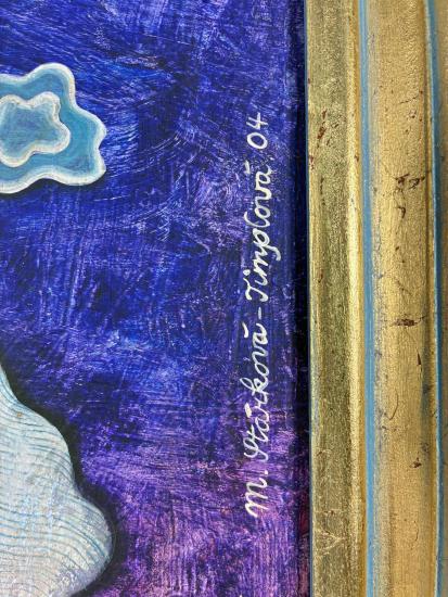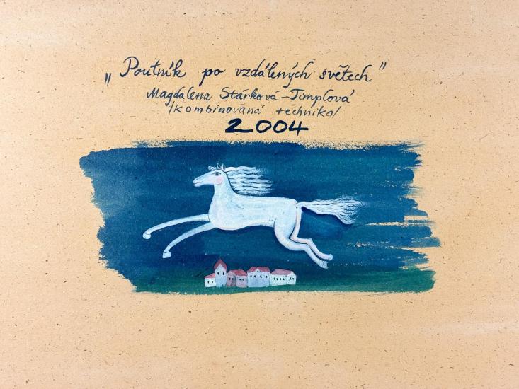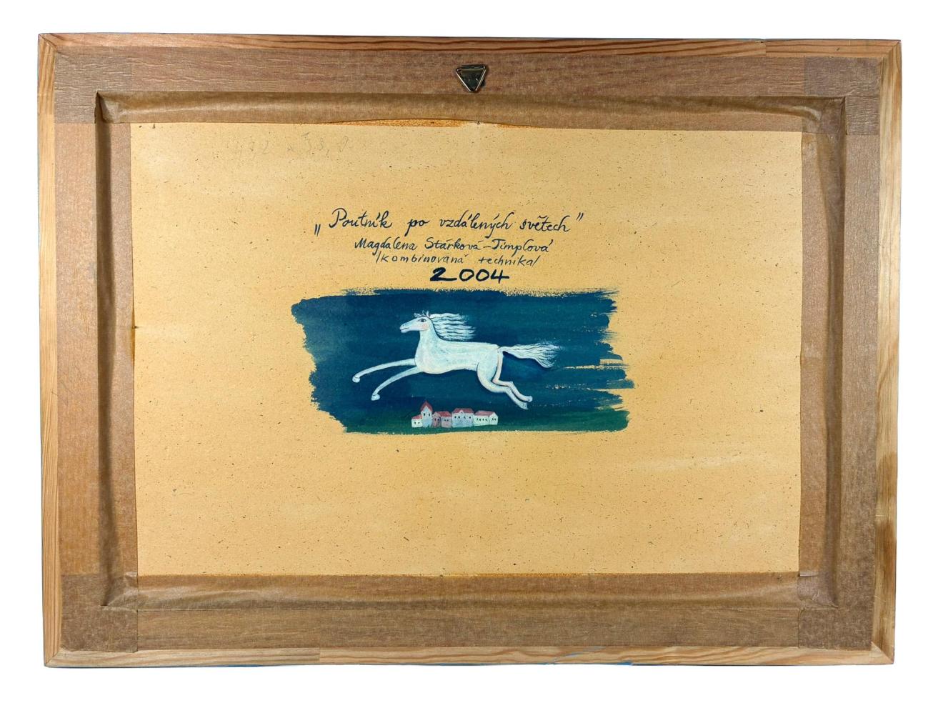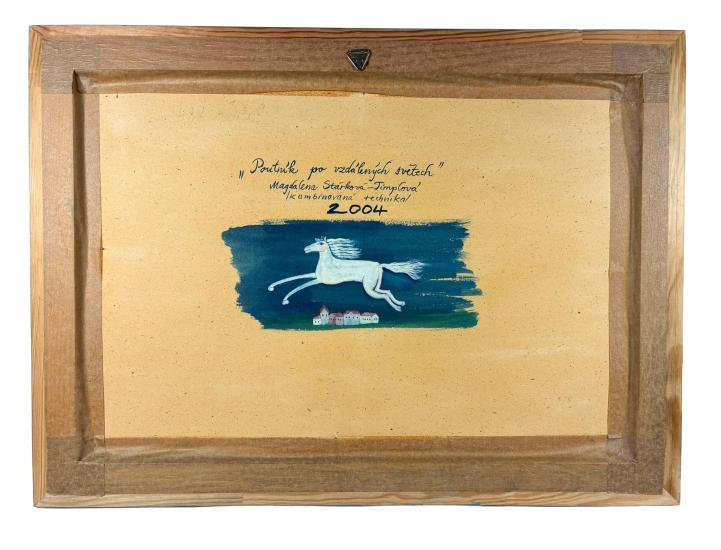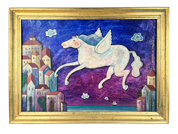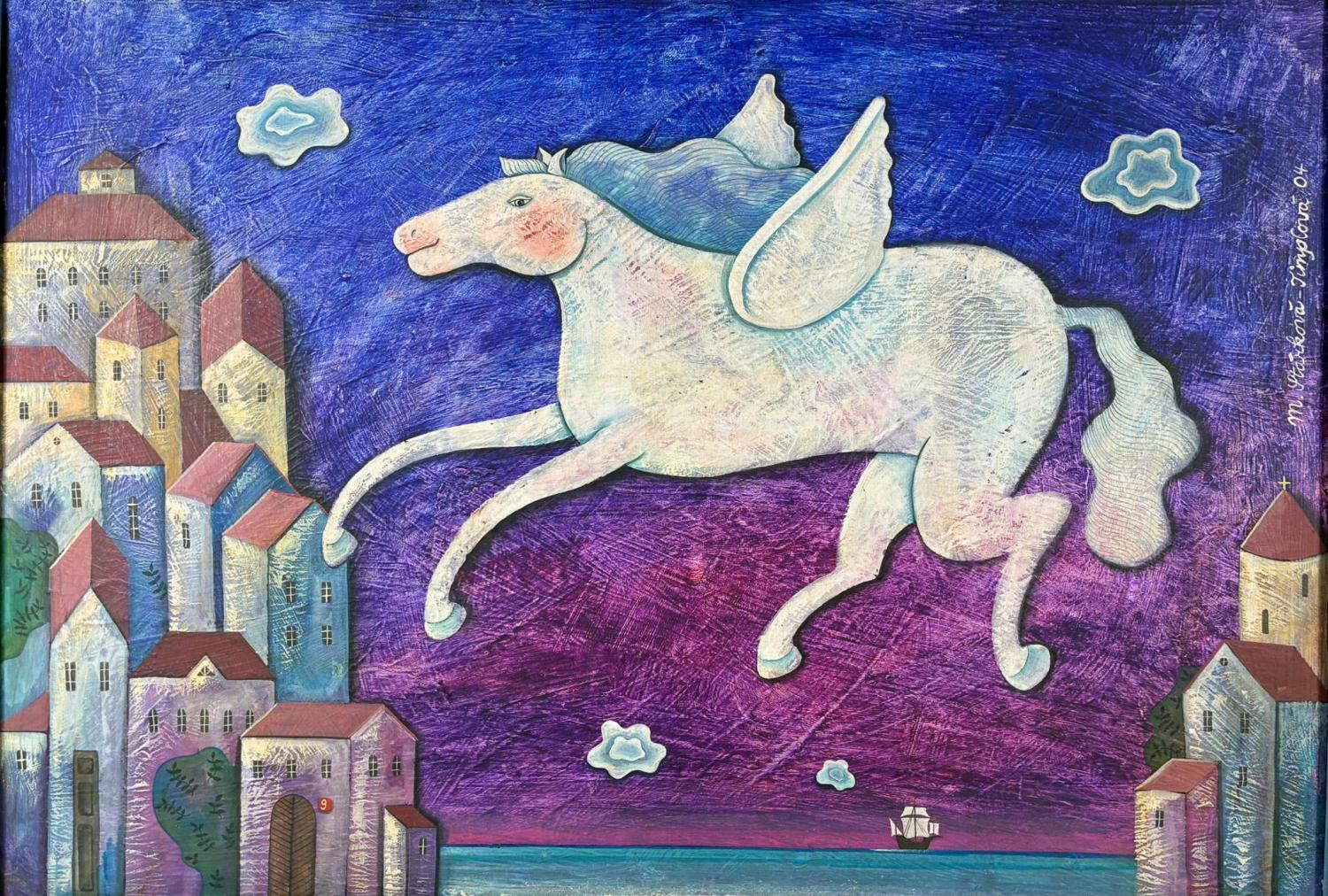 Pěkné, lehce naivní dílo od Magdaleny Stárkové Timpolové. Autorka vytváří pohádkový výjev pegase, který letí nad městečkem. Pozadí vyplňuje fialovo-modrý gradient, malba je místy reliéfní a vyplněná specifickou strukturou. Kombinovaná technika na sololitu, rámováno, rozměry s rámem 56 x 41 cm, rozměry díla 48 x 32 cm. Signováno vpravo na straně " M. Stárková-Timplová 04".