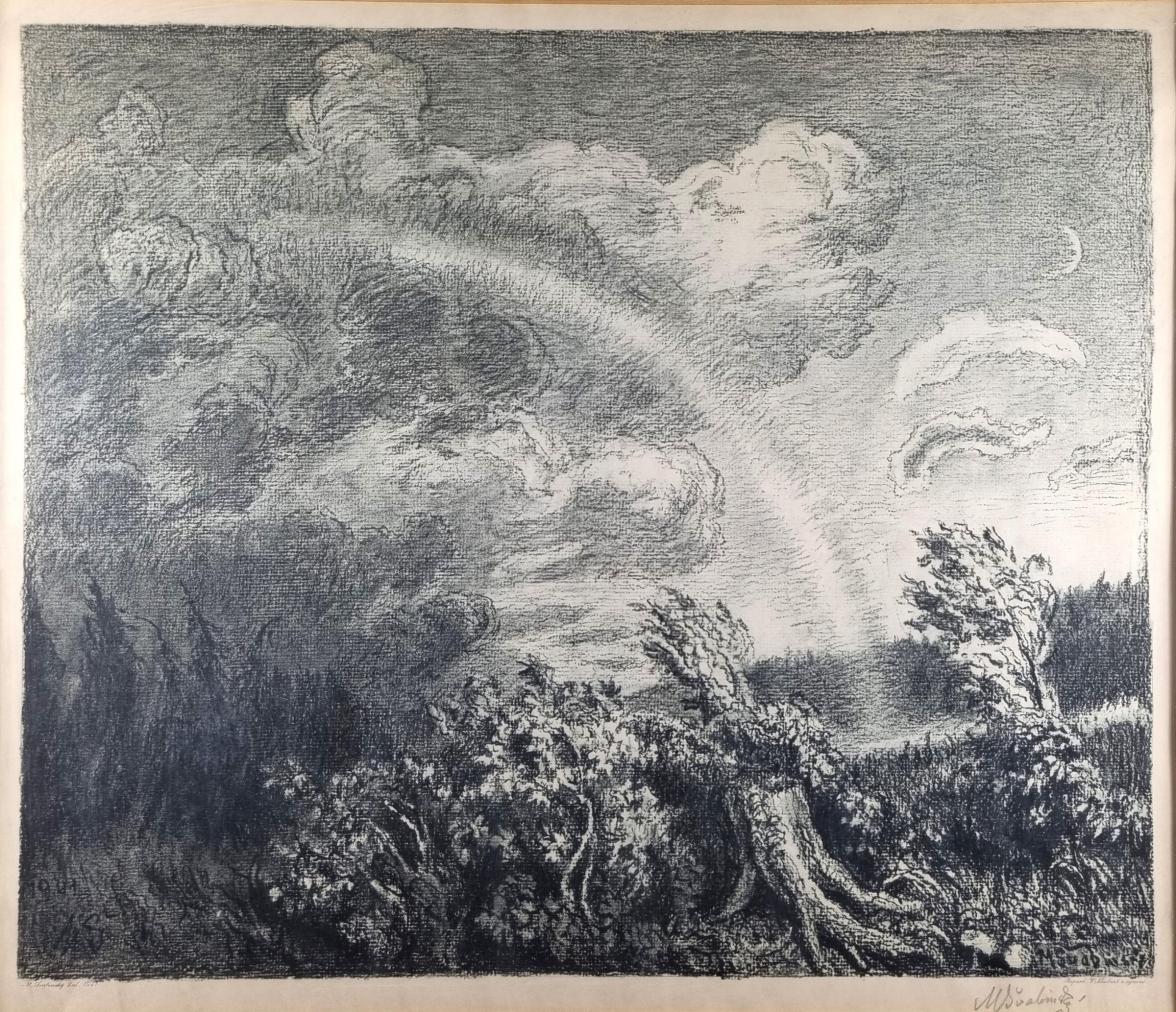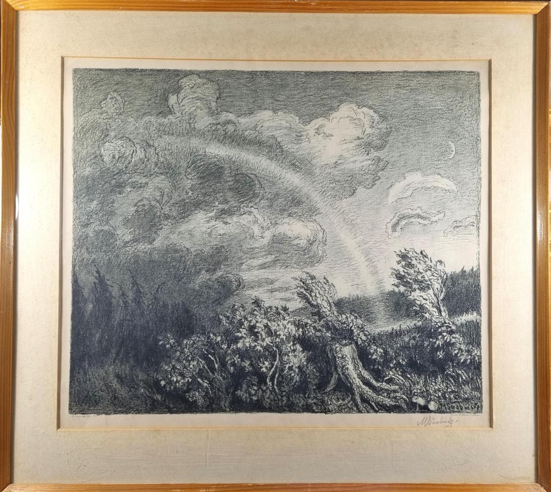 Velkoformátová grafika od Maxe Švabinského. V díle zpracovává téma rozbouřené přírody, za pomoci pokřivených linek, organických tvarů a stínovaných ploch vytváří věrný obraz divoké krajiny, do které přichází bouře a ve stejný moment vysvitla duha. Grafika na papíře, rámováno pod sklem, rozměry s rámem 70 x 63 cm, rozměry tisku 51 x 43 cm. Signováno vpravo dole "M. Švabinský".