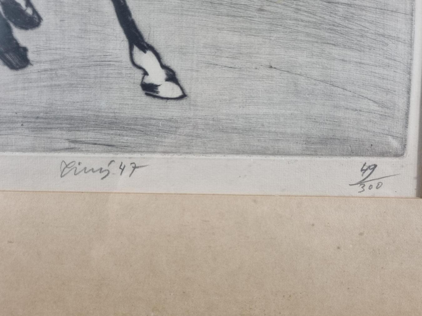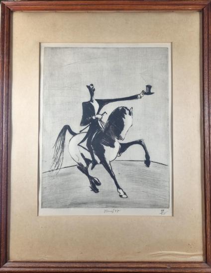 Vekoformátová grafika od Františka Tichého s námětem jezdce na koni, který je právě v průběhu představení. Autor vytváří syté kontrastní plochy za pomocí nahuštění čar těsně vedle sebe, hloubku vyvažuje plochami, které nechává vyznít v čistotě. Tichého stylizace je velmi osobitá a lehce rozpoznatelná. Suchá jehla na papíře, rámováno pod sklem, rozměry s rámem 67 x 53, rozměr grafiky 41 x 32 cm. Signováno dole uprostřed "Tichý 47", výtisk 49/300. Pasparta je lehce poškozena ve spodní části.
