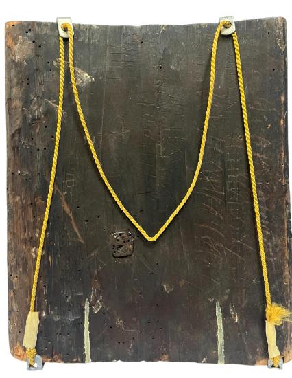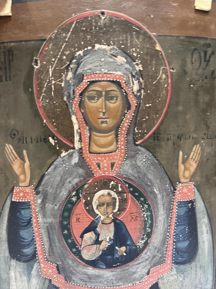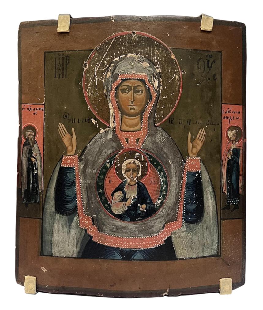 Pravoslavná ikona vyobrazující Matku Boží v pozici oranta se zobrazením Ježíše Krista v kruhu na její hrudi. V malbě se nachází několik škrábanců v oblasti hlavy Panny Marie, Ježíše a tváře postavy na pravé straně, viz foto. Rozměry 27 x 30 cm. Hloubka 5 cm.