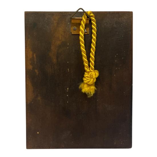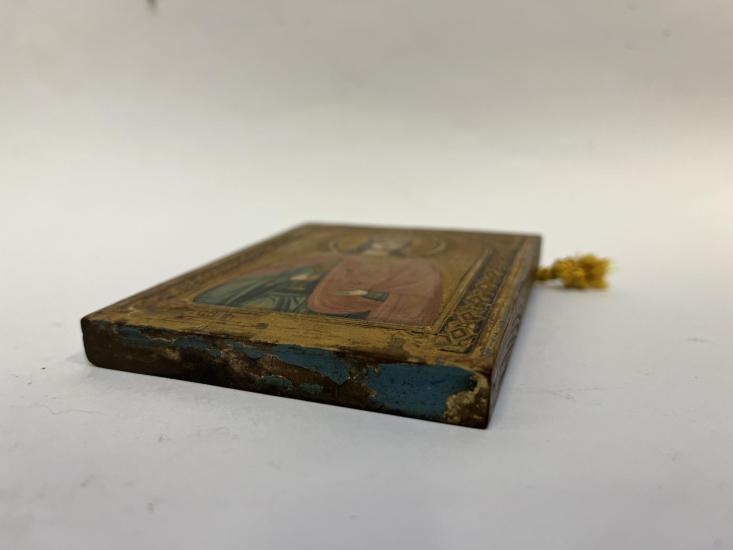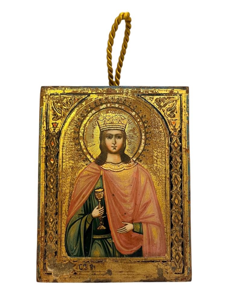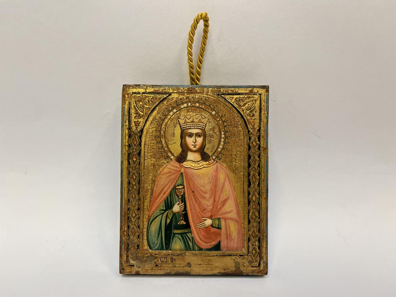 Starožitná ikona svaté Barbory z Nikomédie, vyobrazené na zlatém pozadí s byzantskými prvky, držící kalich. Ikona je v dobrém stavu, pouze na některých místech je vypadená barva, zlacení je místy ošoupané. Modrá barva která ikonu lemovala po stranách na několika místech úplně chybí. Rozměry 9 x 11,5 cm. Hloubka 1 cm.